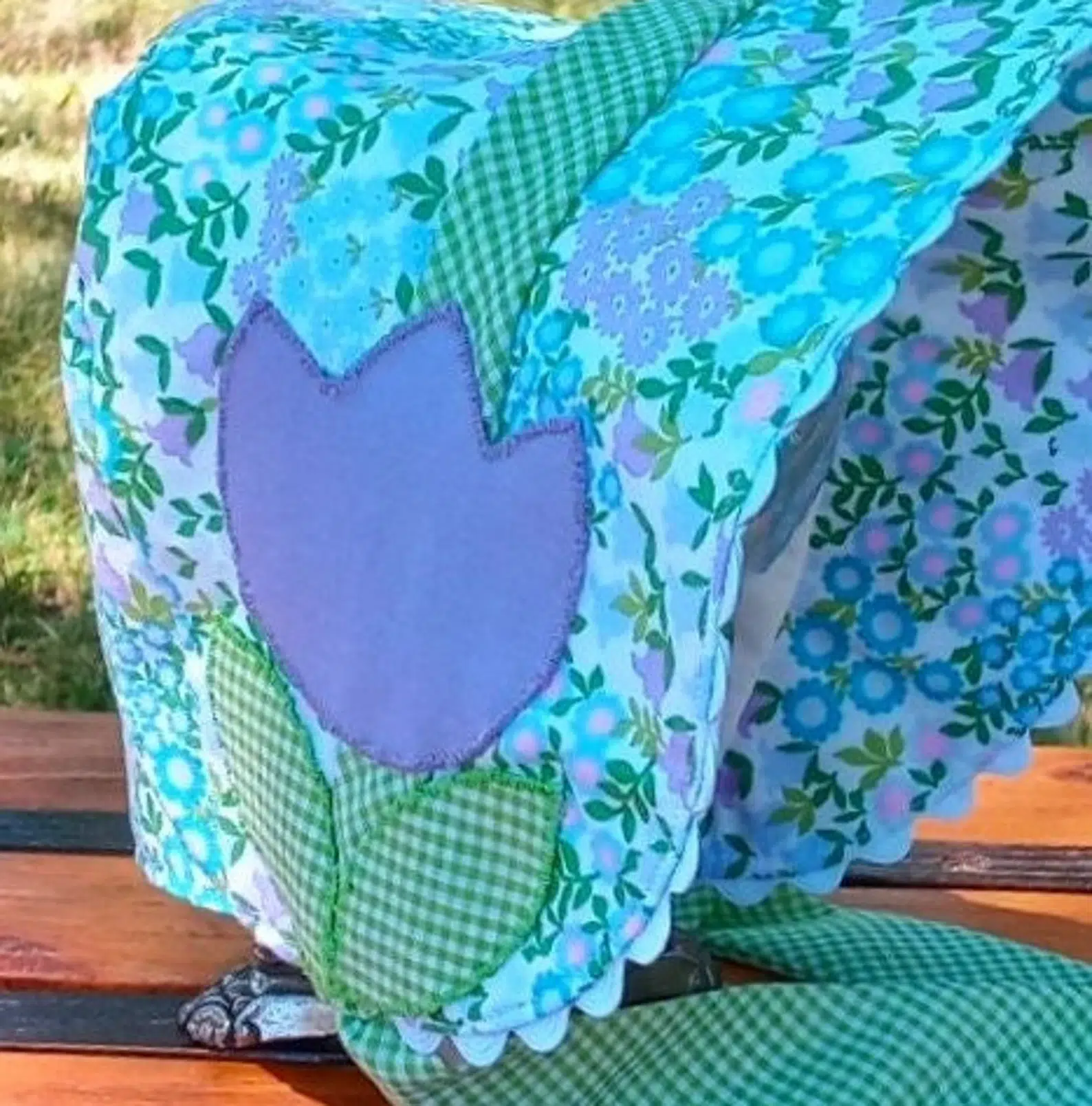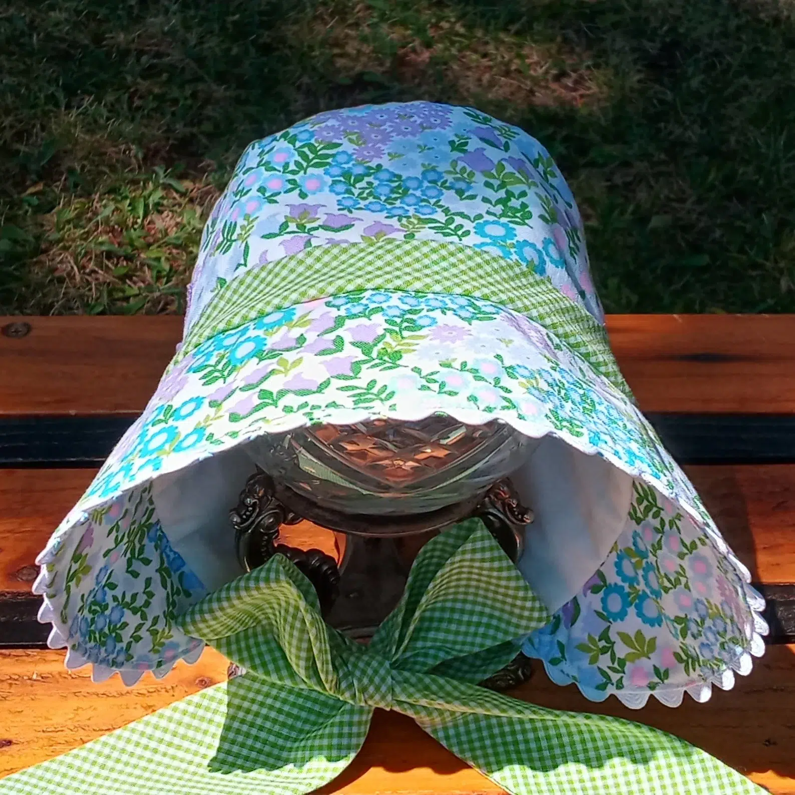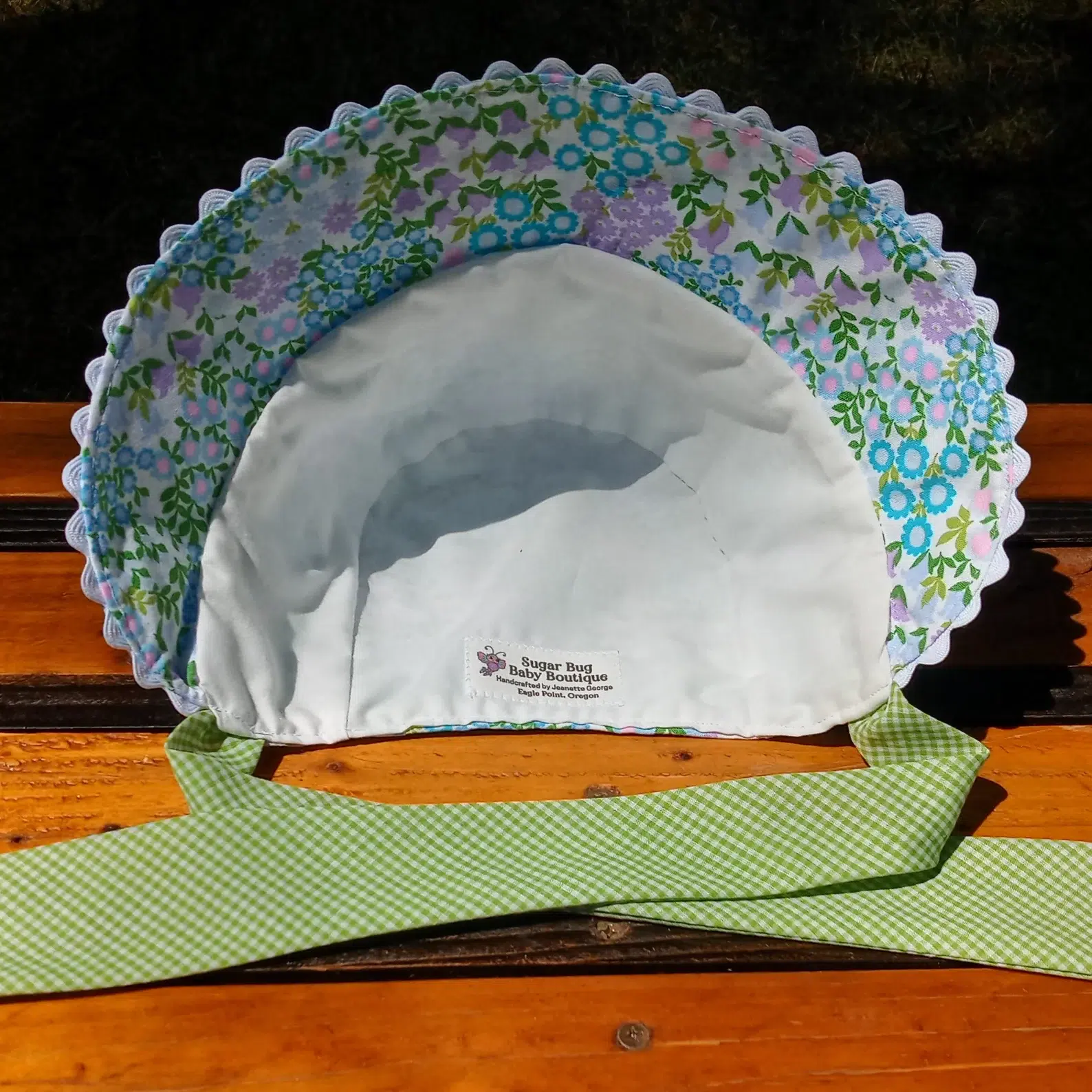 This old fashioned sunbonnet is made from a pretty floral cotton fabric. The medium color purple cotton fabric is used for the tulip on each side of the bonnet. Tiny gingham of green and white checks is used for the leaves, stem and ties. The lining is white cotton. I have the 18 months in stock. You can order in sizes 3 months, 6 months, 12 months or 18 months. If the size you want is in stock, I will send in 2 days or less. Other wise it is a week or two to make and send.
