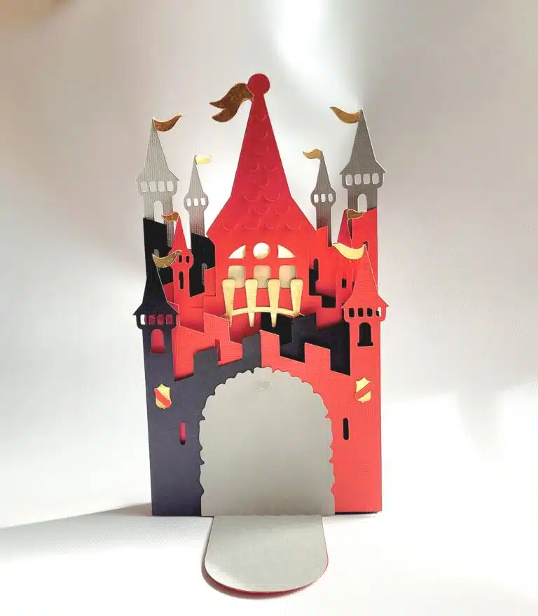 Beautiful, handmade greeting card that is a 3D castle made from black and red card stock with gold highlights. This card can be sent for: