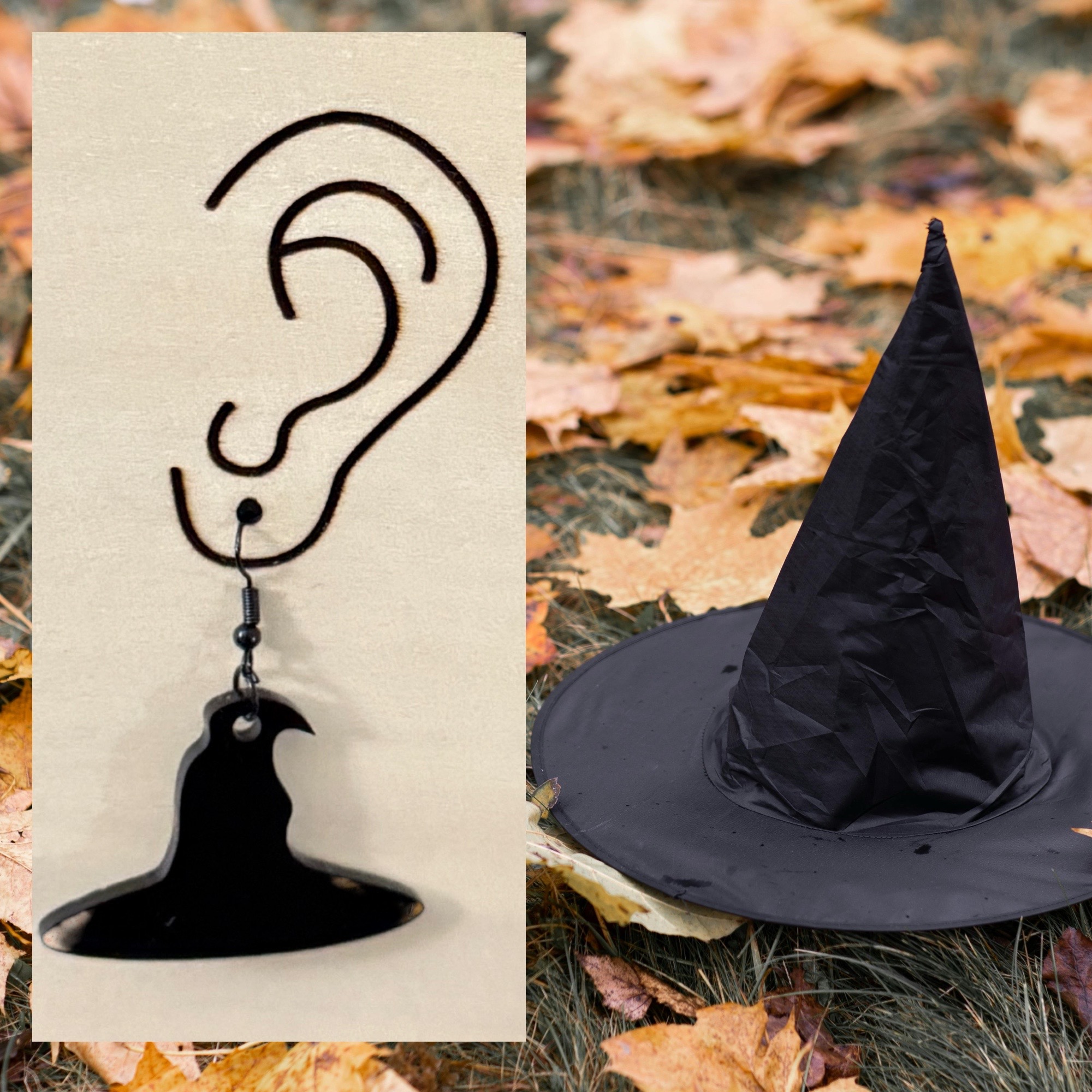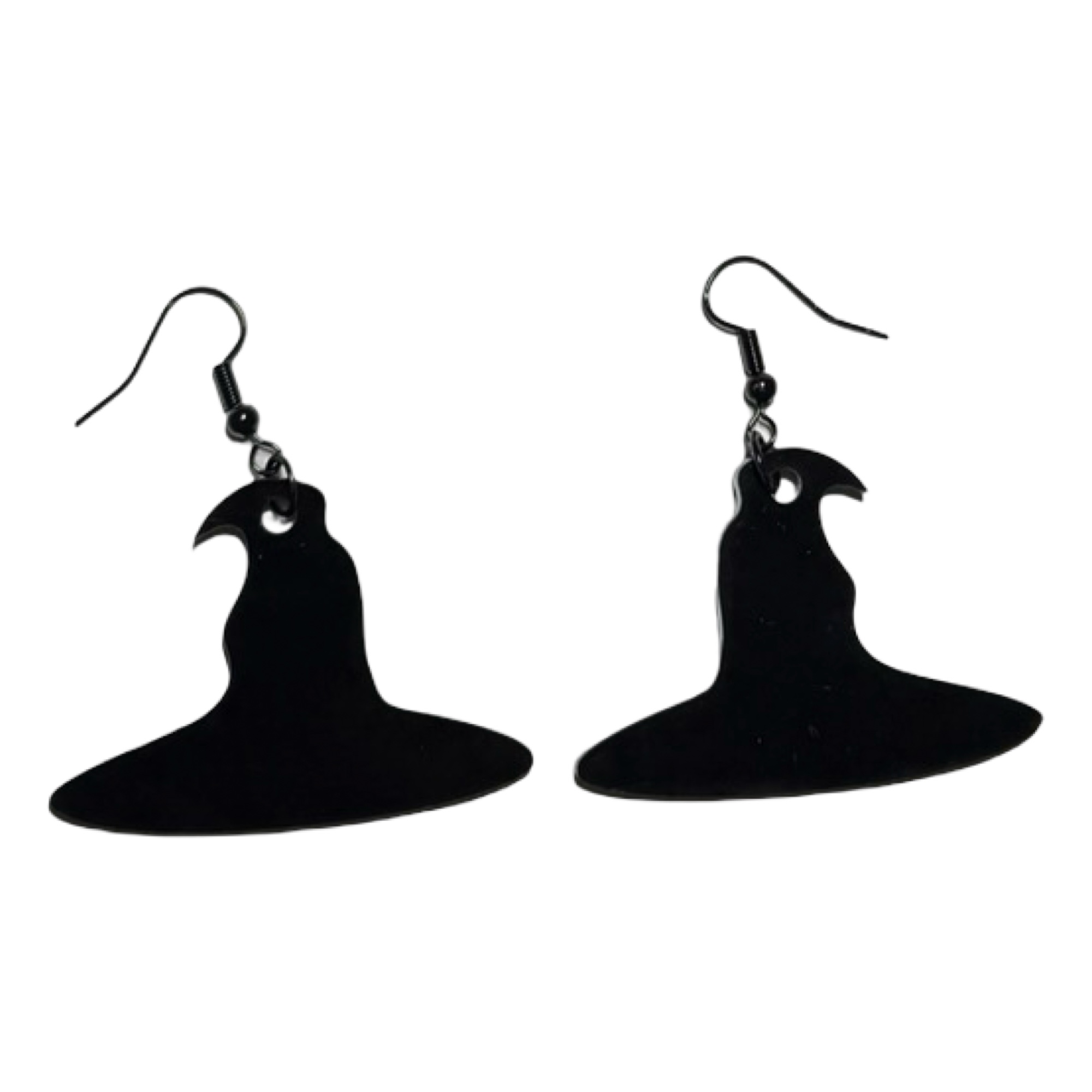 These are a pair of black witch hat laser cut lightweight acrylic earrings. They are made from 1/8 in thick medium black acrylic. They are on ear wires. All metal components are silver, gold, or brass plated, or black alloy, nickel & lead free, and hypoallergenic. They are approx. 1.25″ long. Backs not included but available upon request.