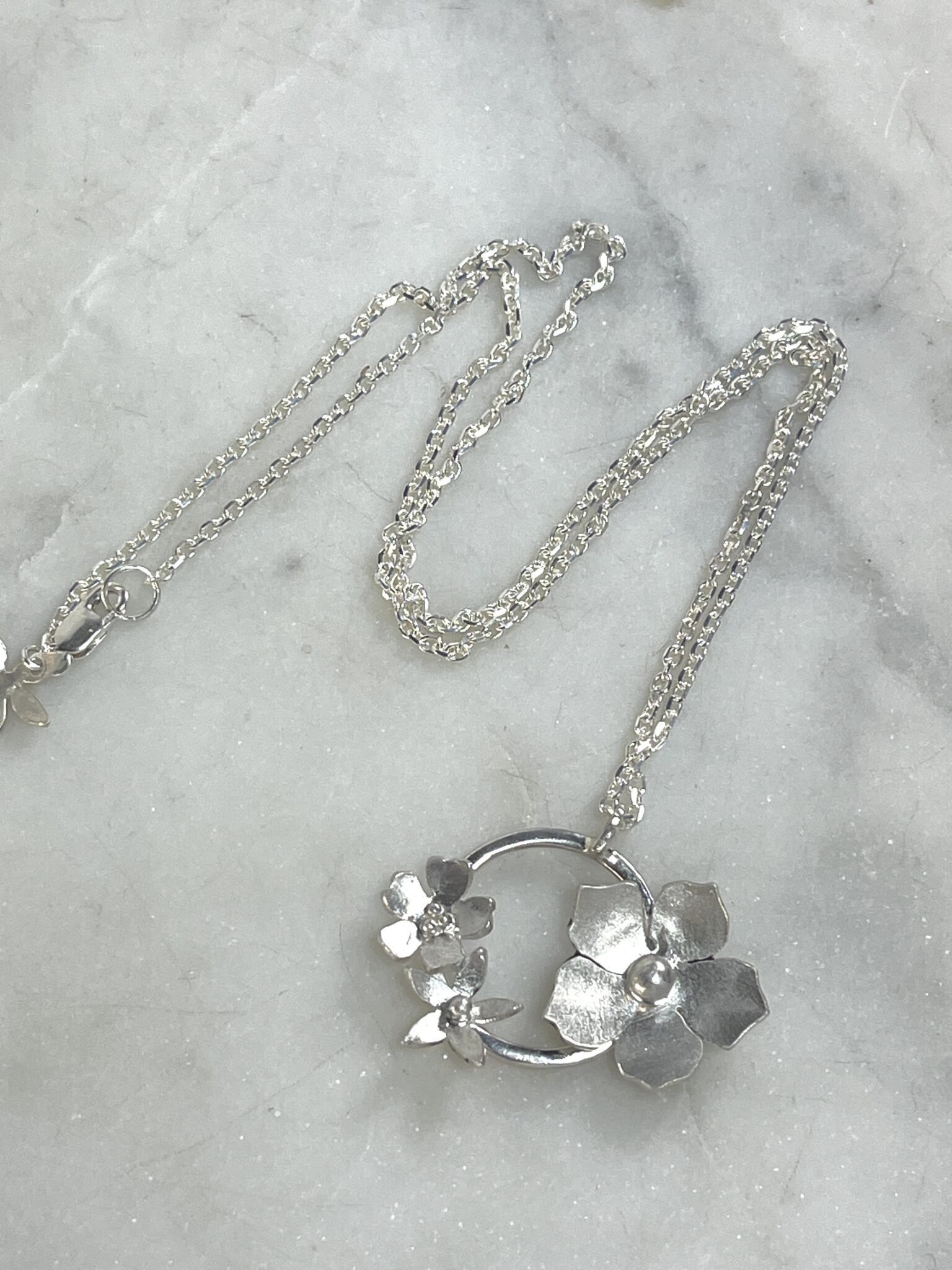 The sterling silver oval chain is 1.7 mm in diameter. It is 18″ long (not including wreath) with small lobster clasp and small blossom counter weight. The wreath is approximately 1 inch long and 1.25 inches at the widest point of the blossoms.
