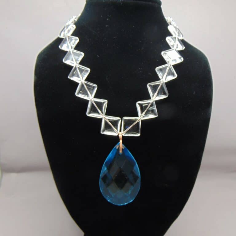 The Pendant is a 2″ by 1.375″ faceted German Chandelier Crystal in watery blue. I have made a bale of Copper for it to hang from the Quartz necklace.