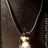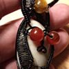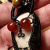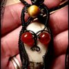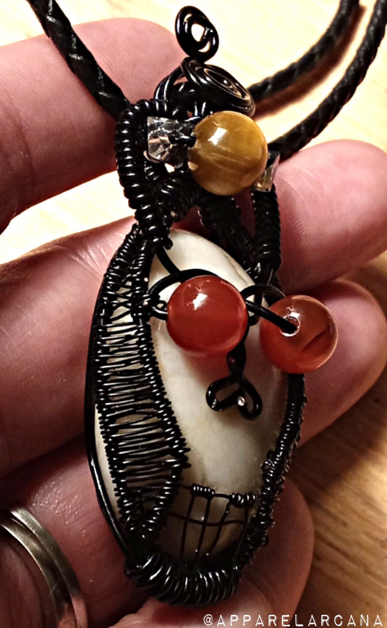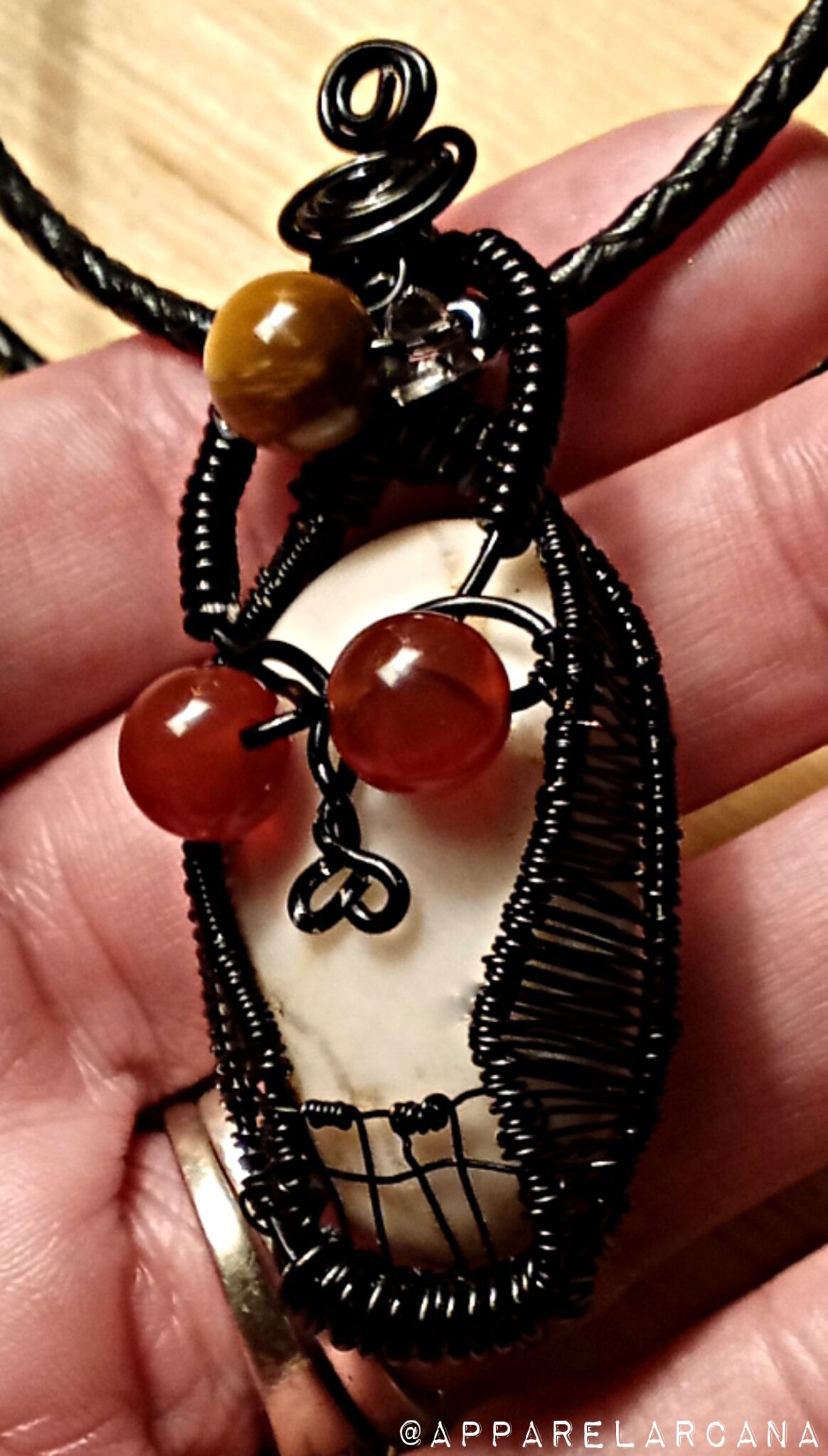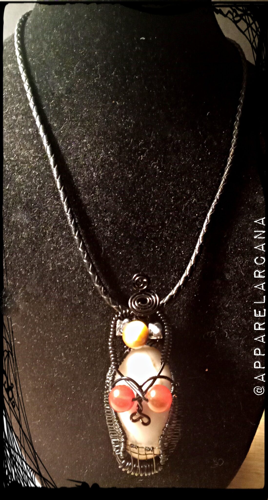 Calavera features a white Jasper focal with some very small druzy inclusions, red Agate eyes, a tiger’s eye bead and two glass accents. Hand wrapped and woven with 20g coated black aluminum wire, with 28g threading on the sides of the skull. It comes with an 11″ drop length 3mm braided leather cord with lobster clasp. Grab the Calavera before 10/31/25 and get a bonus spooky gift!