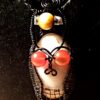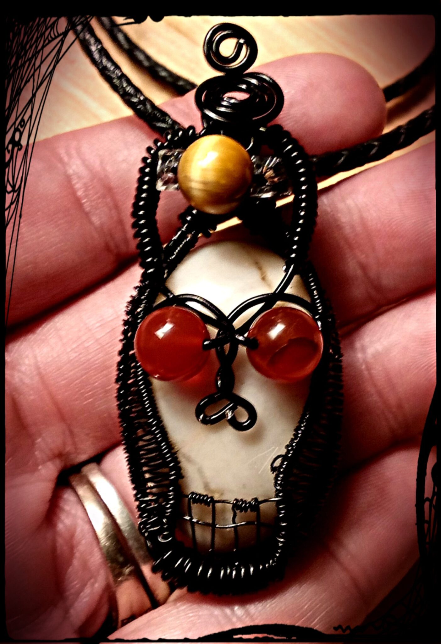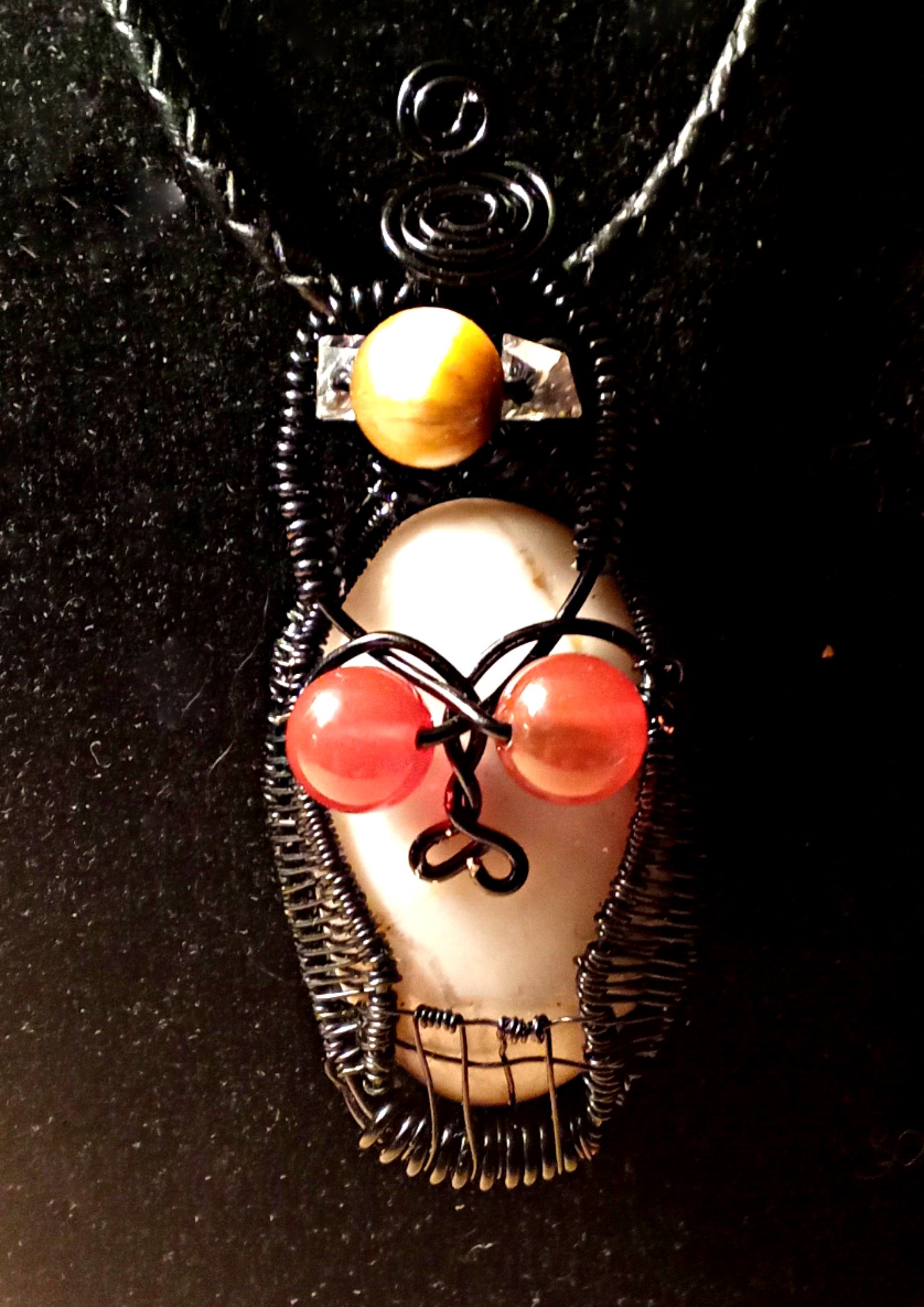 Calavera ~ White Jasper Agate Tigers Eye & Glass Wire Wrap Skull Pendant