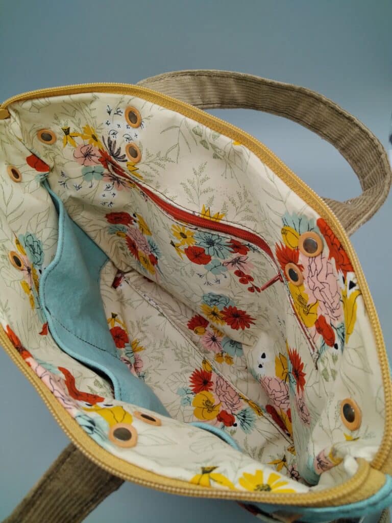 Front and back slip pockets, interior slip pockets, interior zip pocket, zipper close, corduroy handles and strap, leather side connectors. Leather washers for all rivets for stability and durability.