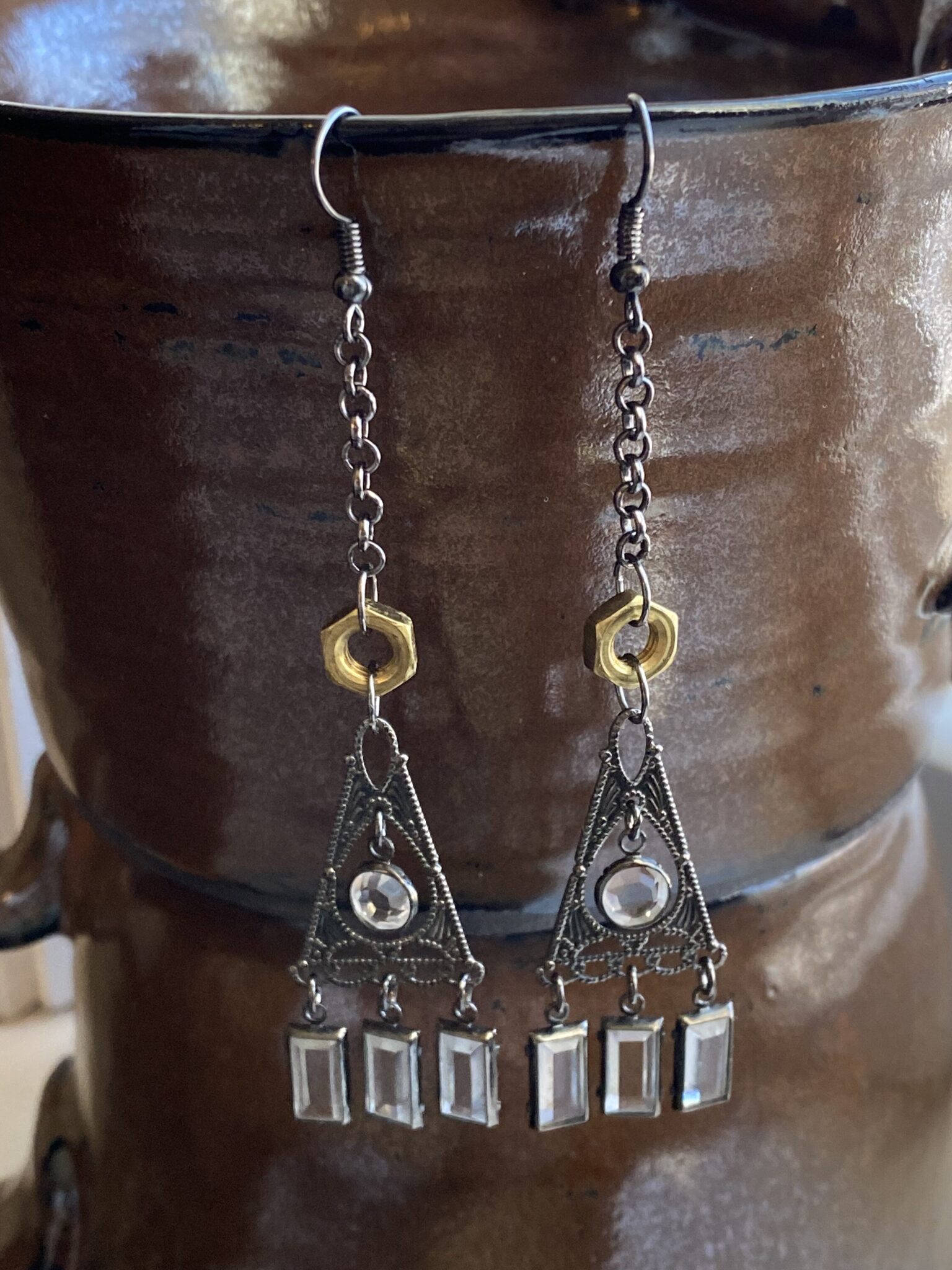 Chandelier Earrings are 100% one-of-a-kind and handmade by me in Massachusetts with junk that would have been thrown away. I love using materials destined for the landfill to create beautiful, functional jewelry, and these earrings are no exception!