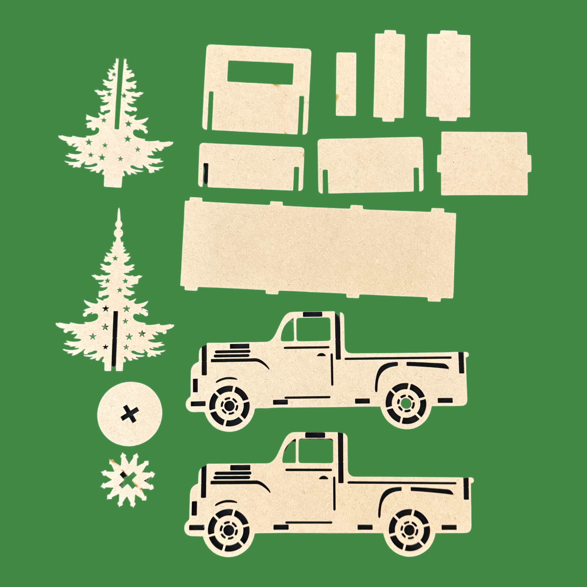 This is a truck with a Christmas tree DIY (Do It Yourself) wood shelf sitter craft paint kit. The pieces are laser cut on 1/8″ inch thick draftboard. It DOES stand up on its own. Glue NOT included. This is NOT a finished and completed shelf sitter. You assemble it, glue it together, and paint it yourself.
