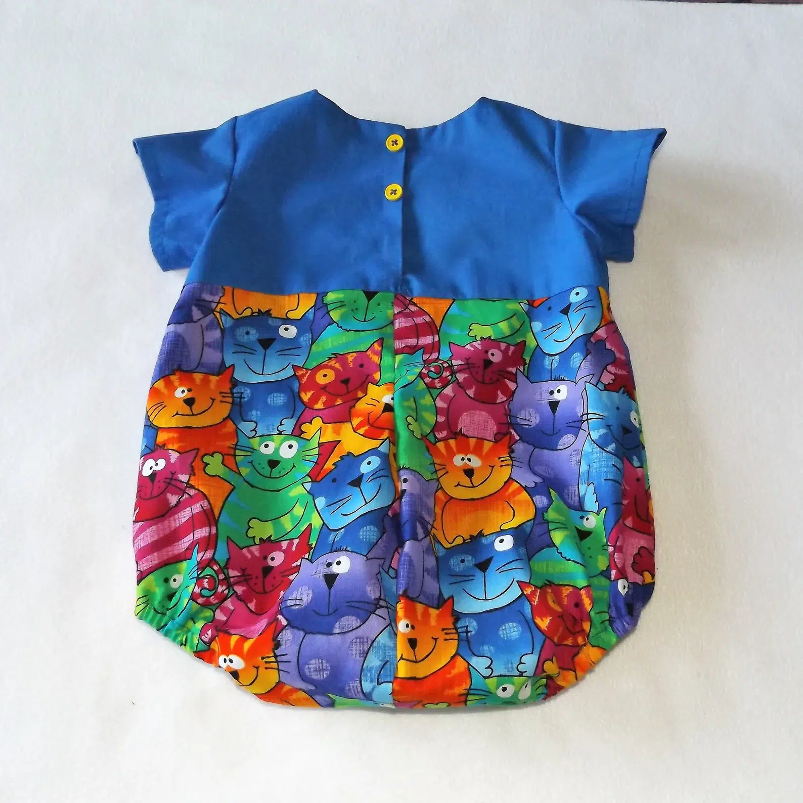 A very cute, bright, and colorful print of happy, cool cats. That is used for most of the romper. The attached shirt is a bright blue. There are white buttons on the straps to match the eyes. Decorative buttons on the shirt front. Elastic and snaps at the lower legs. The shirt has short sleeves and bodice is fully lined. The one in stock has snaps and buttons in back. You can have buttons and buttonholes instead. Sizes are Preemie-7lbs, 1-3 months, 6 months, 12 months or 18 months. If I have it in stock in the size you want I will send in 2 days or less if not it is 1-2 weeks.