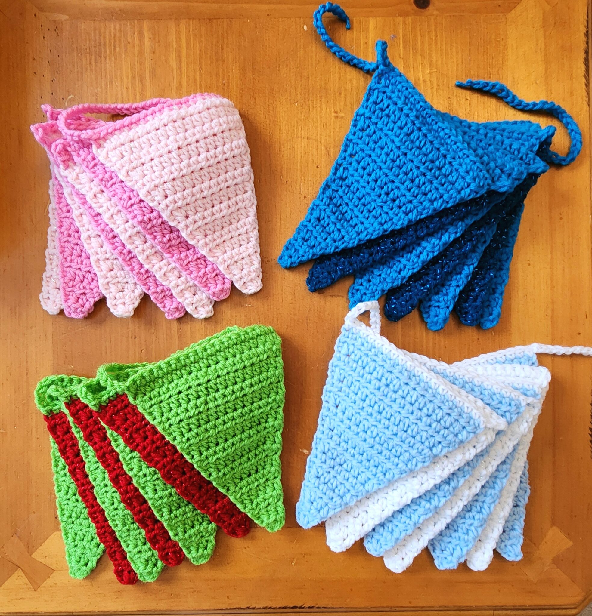 Add some fun to your decor with these crochet buntings! They can be used for holidays, parties, gatherings or anything where a little extra flair is desired. Each one is about 4ft long not including the ties and they do stretch a little bit. Each bunting contains two colors, one of which is made with sparkle yarn for extra fun! An added bonus is that they are washable and reusable. Many of the color combinations can be used for multiple events or special days. Check back on occasion for more color combos.