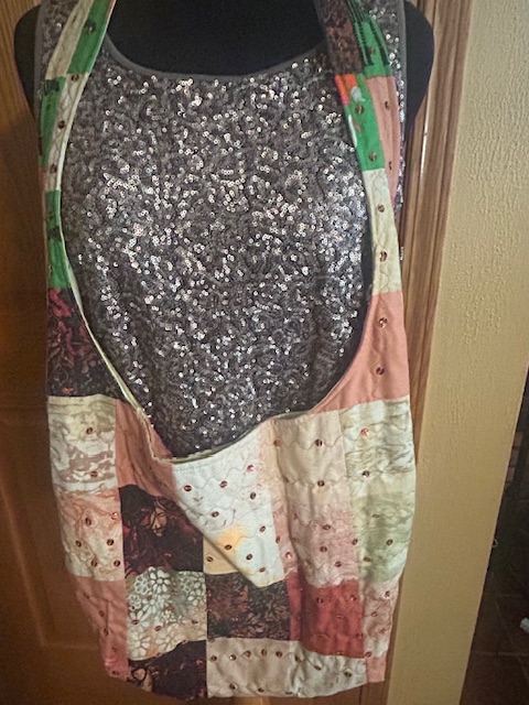 This crossbody bag is designed in a patchwork style using shades of orange batiks and cotton fabrics. Sequins have been added for a touch of bling. This boho crossbody bag is another one of our most popular bags. This hippie bag is the perfect carry-all for everyday use. Features a 2″ wide strap that can be worn over the shoulder for comfort and style. The boho purse measures 36″ long from the top of the strap to the base of the purse. The purse body is 16″ x 16.” The boho purse is fully lined with hand-dyed cotton fabric with a pocket on each side. Pockets measure 6″ x 6″, perfect size for a cell phone, keys, or sunglasses. The magnetic snap closure keeps belongings secure. This purse is a unique, one of kind design sure to get you noticed.