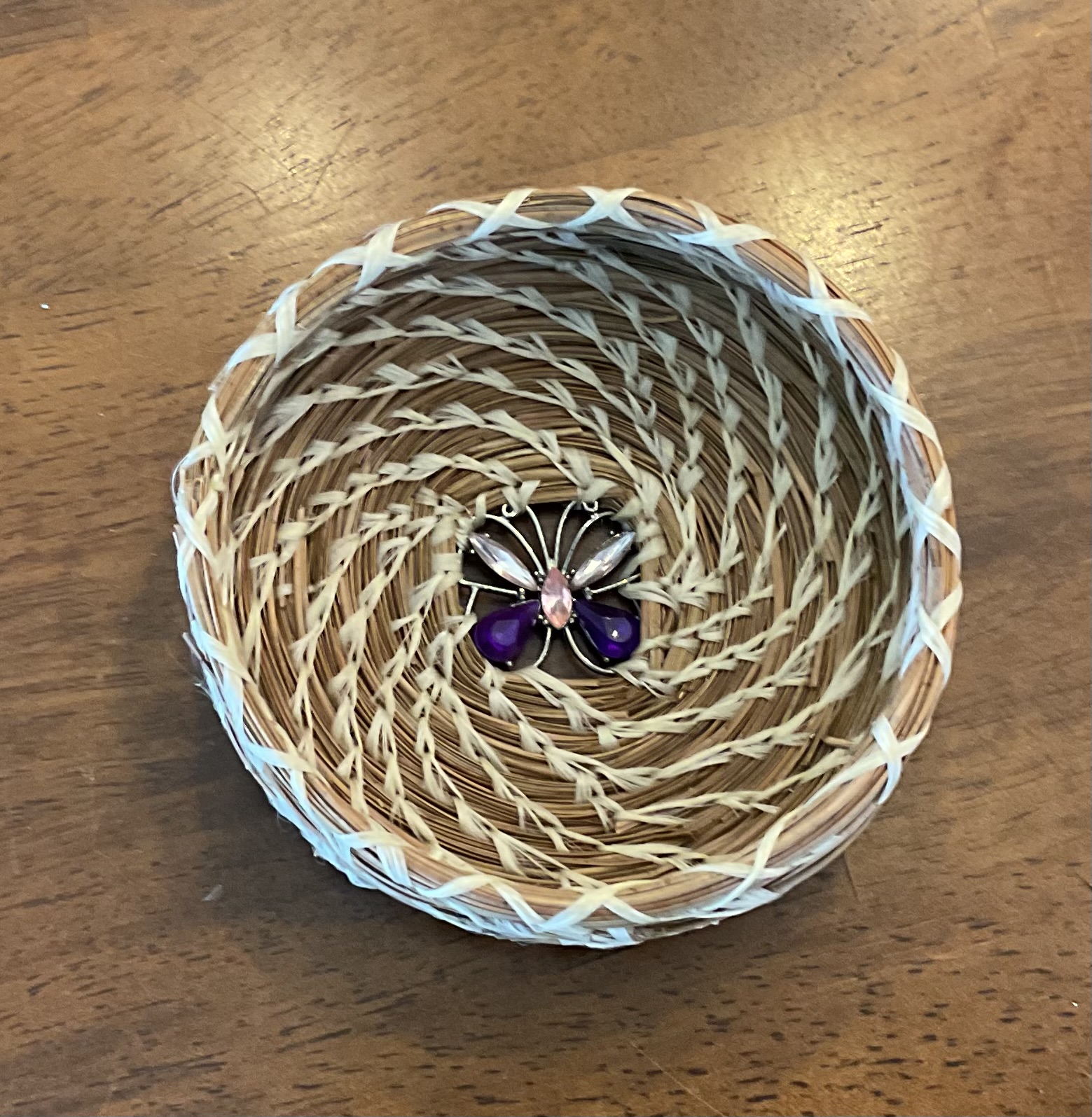 Enhance your home decor with this charming hand woven basket from long pine needles featuring a purple butterfly accent. Perfect for adding a touch of nature-inspired elegance to any room.