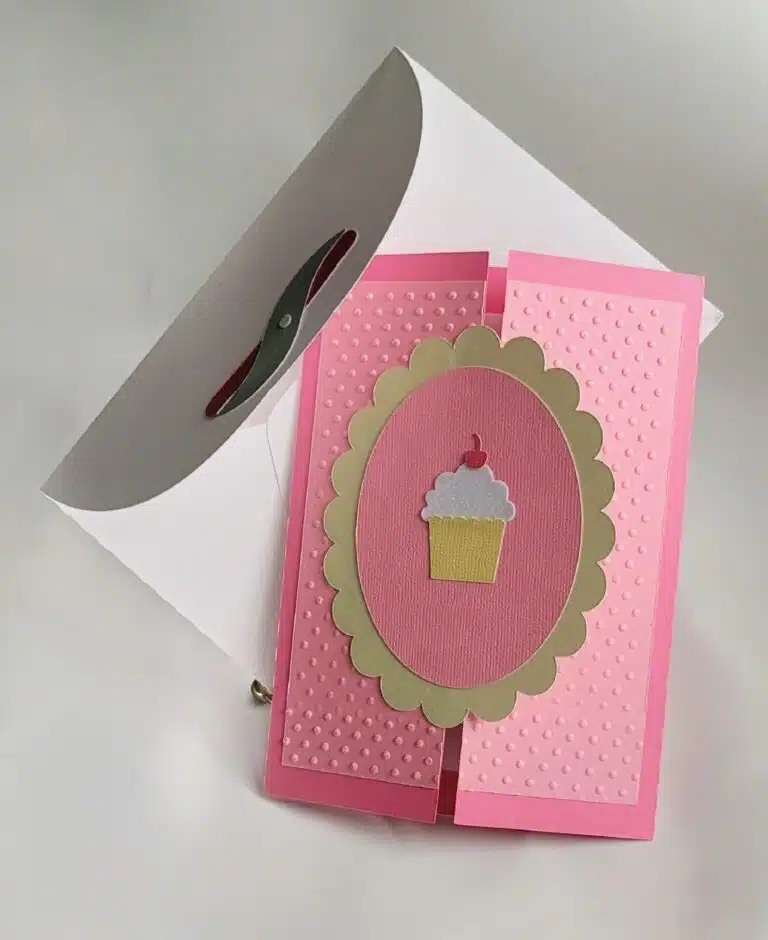 Cupcake gatefold card, very cute, can be used as a thank you card,  note card,  for birthdays or to say “Hi”. This is a gate fold card, and opens in the middle, with plenty of room inside for your message.