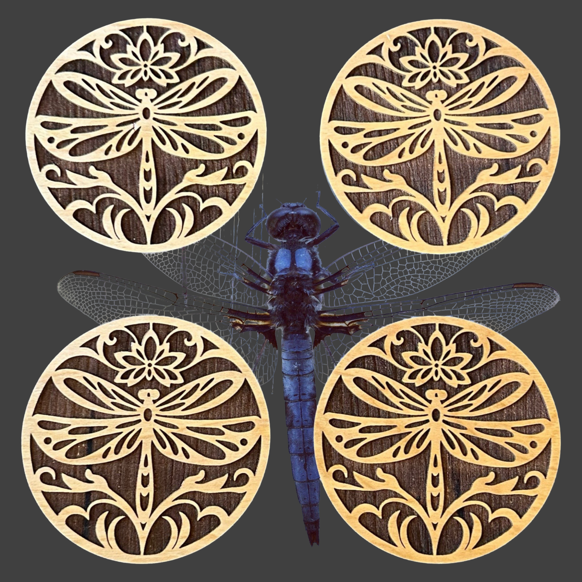 This is a set of 4 laser cut and engraved lightweight wood coasters. They are round with dragonflies engraved on them. They are cut out of 1/4 in thick cherry plywood. They are approx. 4’x4′ inches in size. They are sealed wood on both sides.