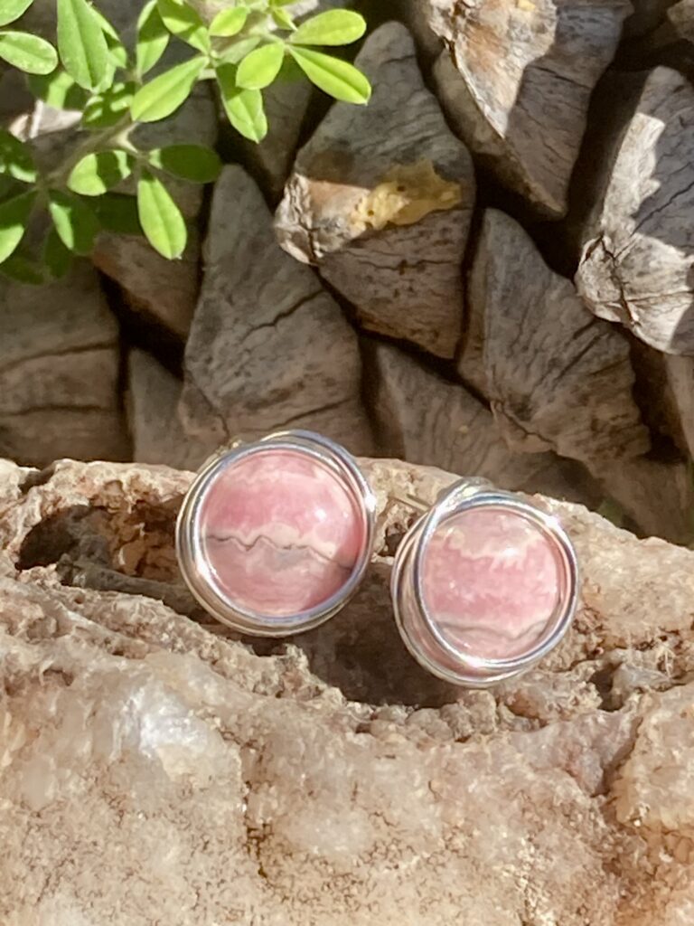 Beautiful Rhodochrosite gemstone stud earrings. These lovelies are made with a tiny cabochon (not a bead), hand wrapped in sterling silver wire and back. Measures 3/8″ round.