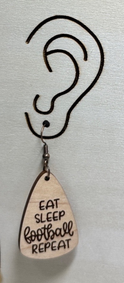 These are a pair of laser cut wood eat, sleep, football, repeat wood dangle earrings. There is no design on the back. They are made from 1/8 in thick medium maple hardwood. They are on ear wires. All metal components are silver, gold, or brass plated, or black alloy, nickel & lead free, and hypoallergenic. They are approx. 1.5” in long. Backs not included but available upon request.