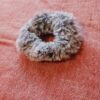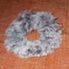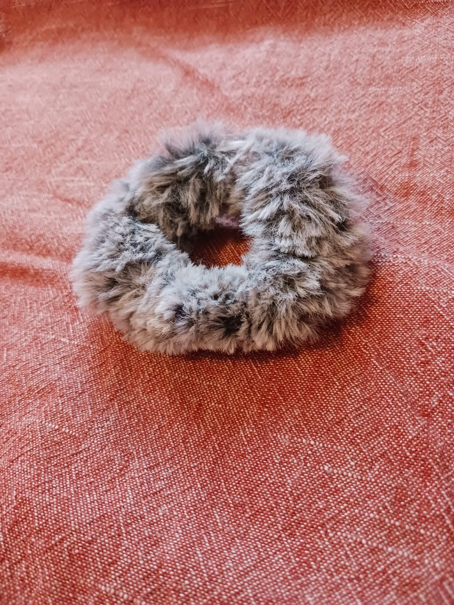 A crochet scrunchie made with faux fur yarn, this scrunchie comes in a wolf, black white, color. This yarn is made of 100% polyester, and it is very soft to the touch as well as very fuzzy.