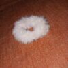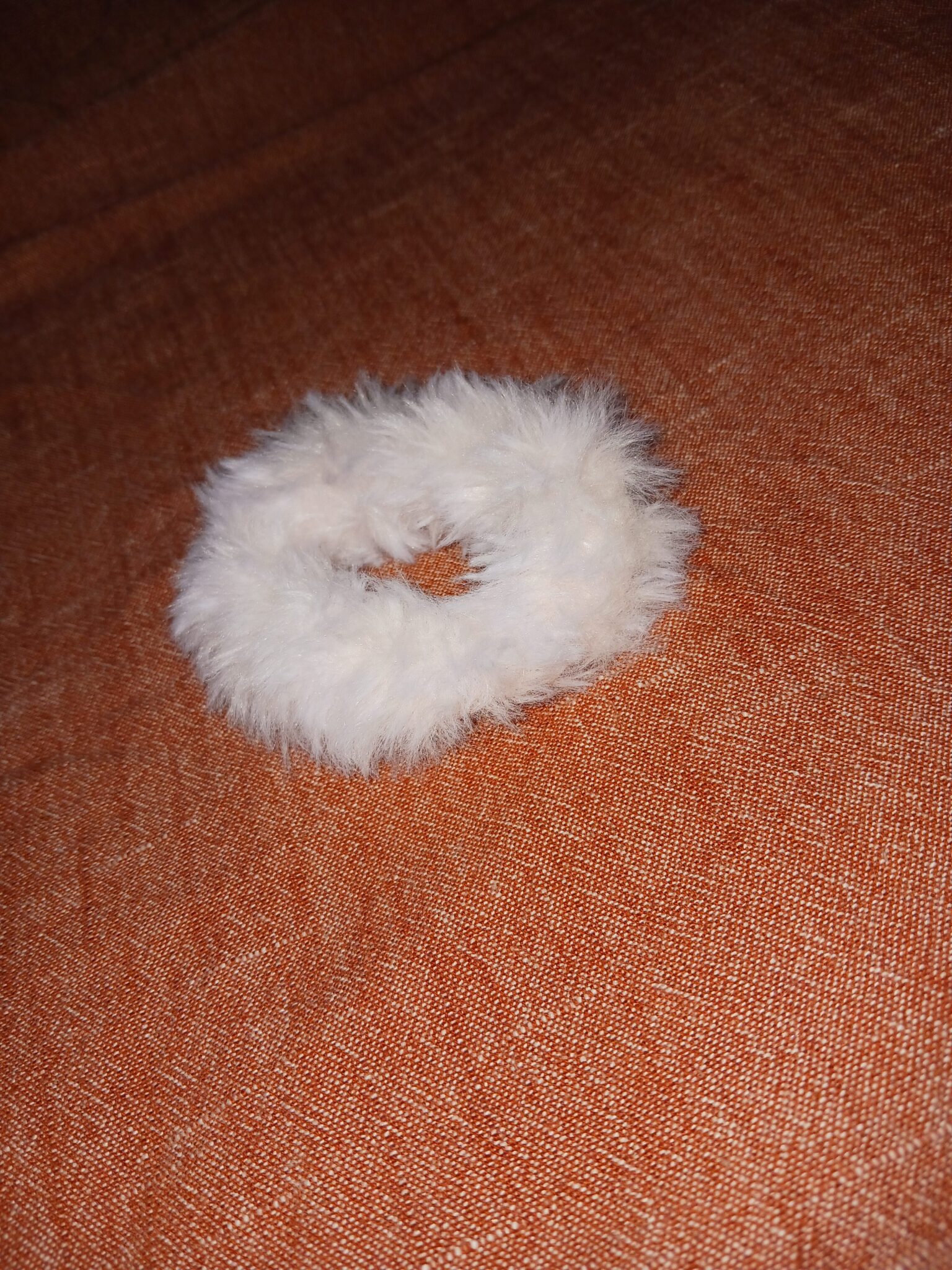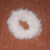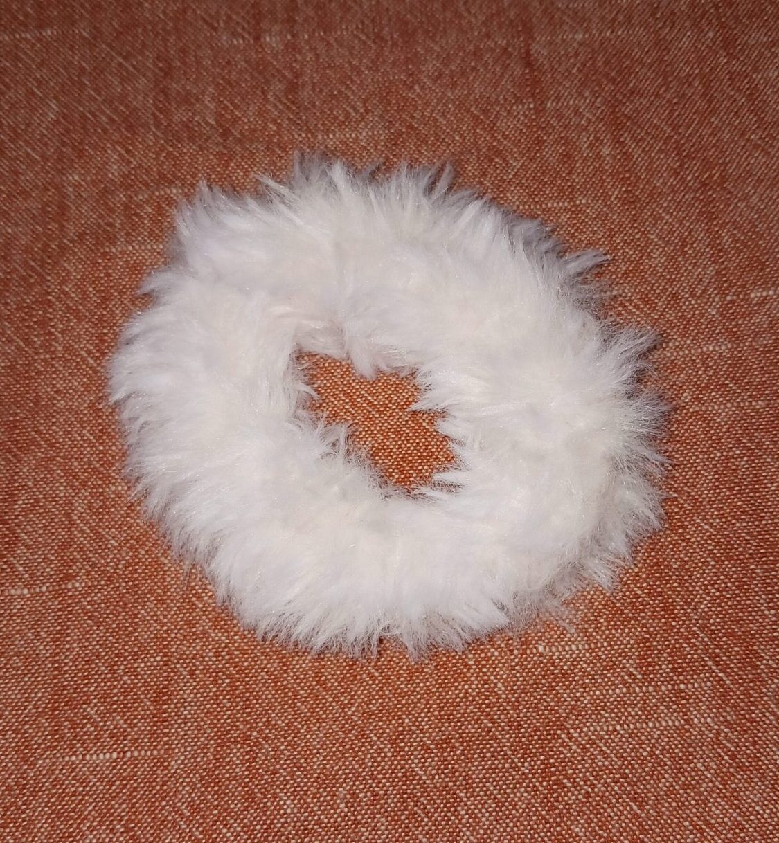 A crochet scrunchie made with faux fur yarn, this scrunchie comes in a soft pink color. This yarn is made of 100% polyester, and it is very soft to the touch as well as very fuzzy.