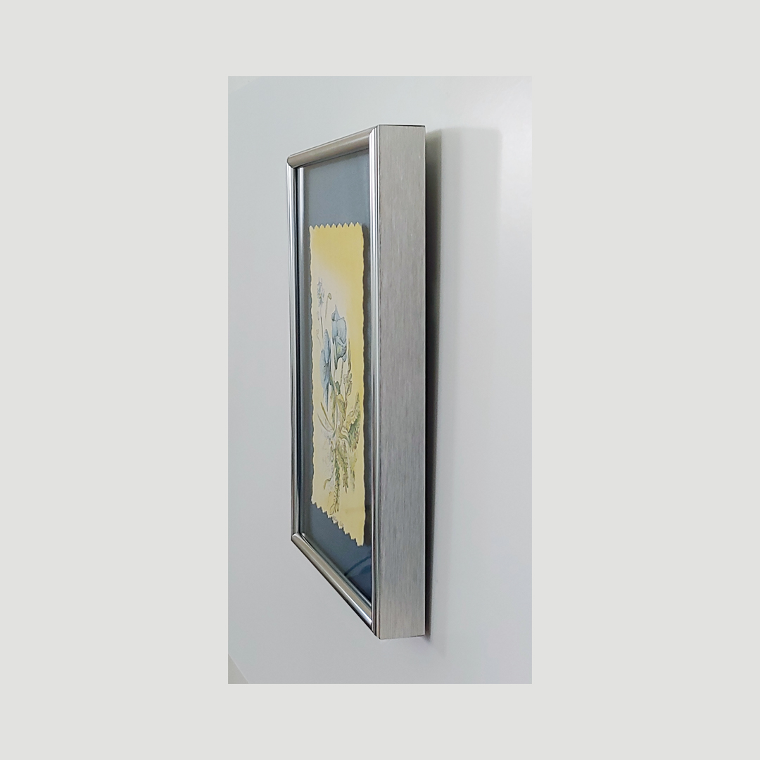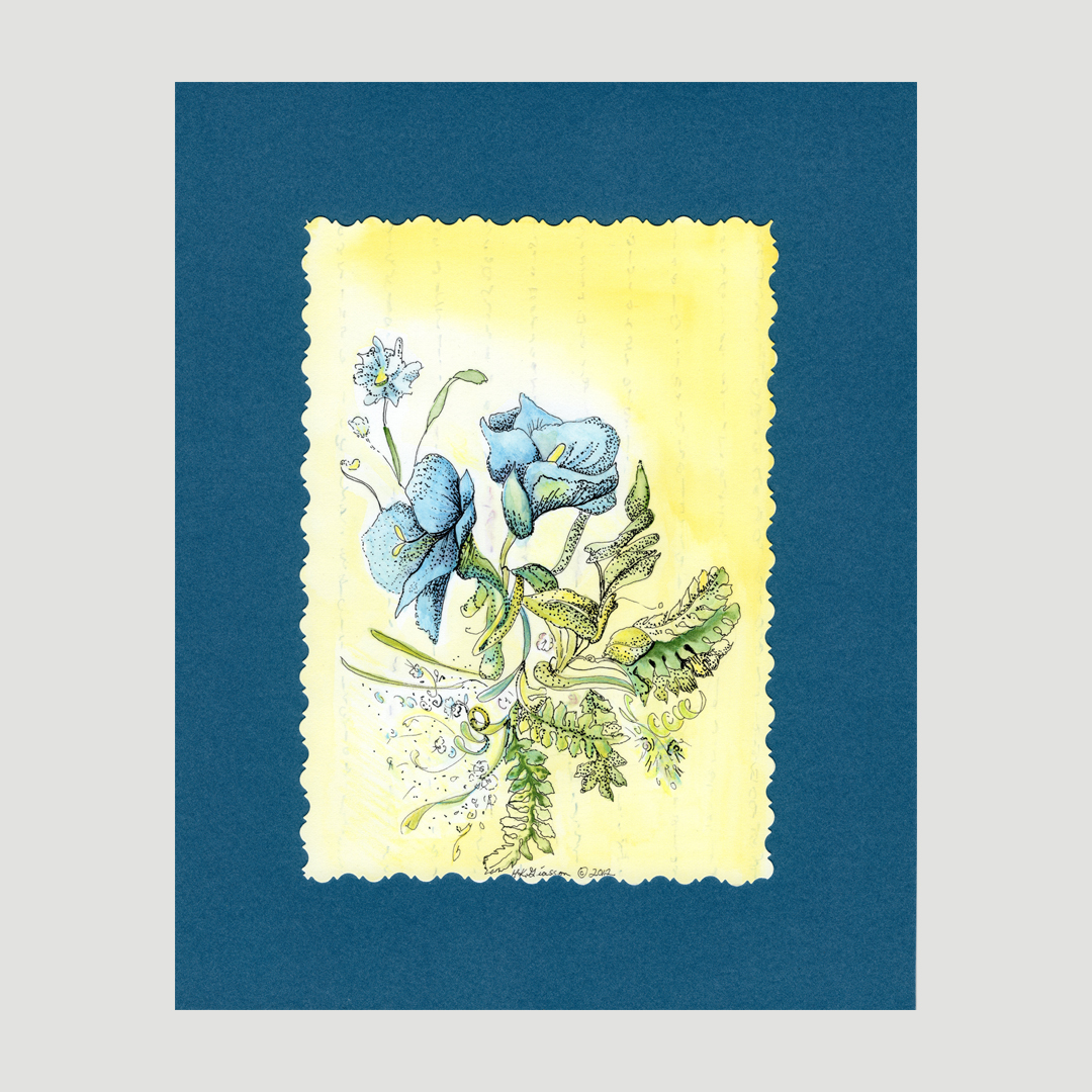 Floral Burst 6 is a small yet radiant study in botanical elegance, rendered delicately in watercolor on a 5 by 7-inch format. At its heart, a cluster of blue flowers unfolds with meticulous petals and finely shaded green leaves—each line purposeful, each curve imbued with quiet life. The floral composition rests within a soft yellow field edged by a hand-deckled, scalloped border, a subtle frame that both contains and gently elevates the natural subject. This arrangement is set against a deep blue mat that intensifies the colors, drawing the eye to the textured depth and refined detail of the blossoms. Matted to 8 x 10 inches and framed in a slender metal frame to 8.25 x 10.25 inches. Ready to display, shipping included.