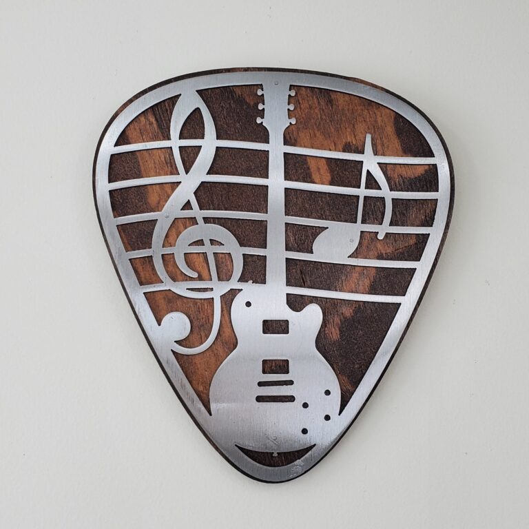 This stunning metal art piece is perfect for music lovers. Featuring a large ornate guitar pick set against a stained wood background, it’s intricately designed with musical notes and other details. The metal and wood combination creates a unique artwork that’s sure to make a statement. It’s perfect for indoor display and can also be used outdoors if displayed in a covered area. Handmade in Minnesota, it comes with a sawtooth hanger on the back for easy hanging. Order now and surprise your music enthusiast friend or family member. This is for the 18 inch version. Contact us for other sizes and designs.