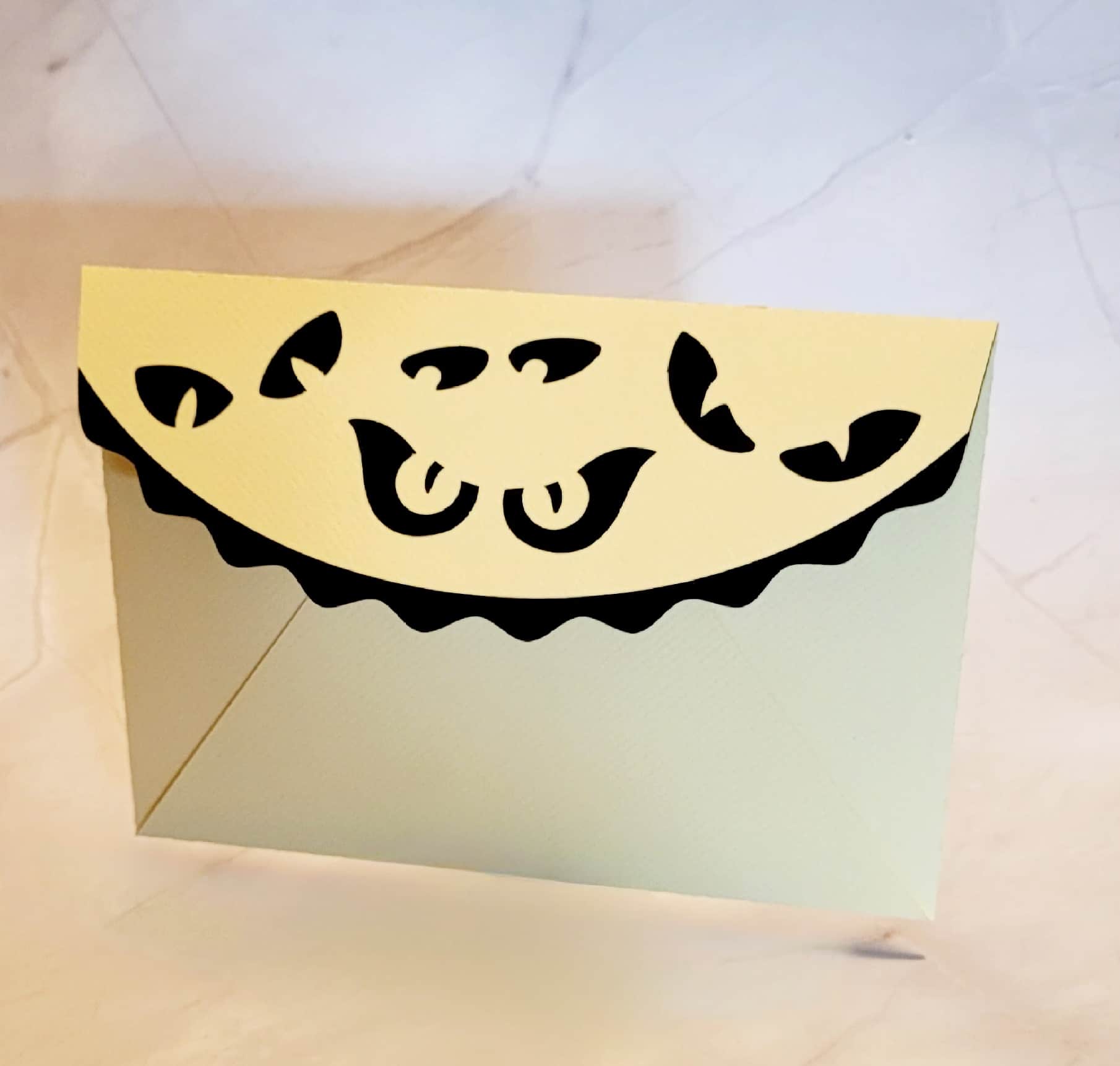 Imagine their surprise when the person that receives this card opens it to see BOO and a scary pumpkin looking at them. It’s Halloween fun in a card! Even the envelope has creepy eyes on it. There is plenty of room to write a personal message in the card too, maybe in red ink to simulate blood. 🙂  Have fun sending these cards for Halloween!