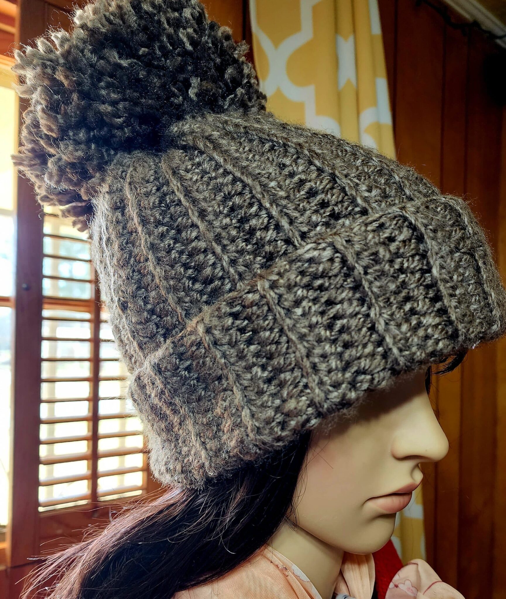 Keep your noggin warm with this handcrafted, crocheted hat with puff ball.