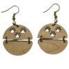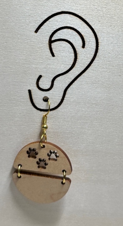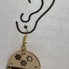 These are a pair of laser cut lightweight circle paw print wood dangle earrings. They are made from 1/8 in thick medium wood. They are on ear wires. All metal components are silver, gold, or brass plated, or black alloy, nickel & lead free, and hypoallergenic. They are approx. 1.25” in long. Backs not included but available upon request.