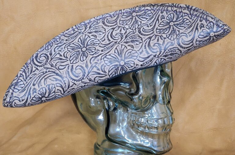 This is a handcrafted, real leather tricorn pirate hat with a deep purple and black crown and a brown brim with an embossed brown underside. There is no inner band. Size 22.5 inches/57 centimeters