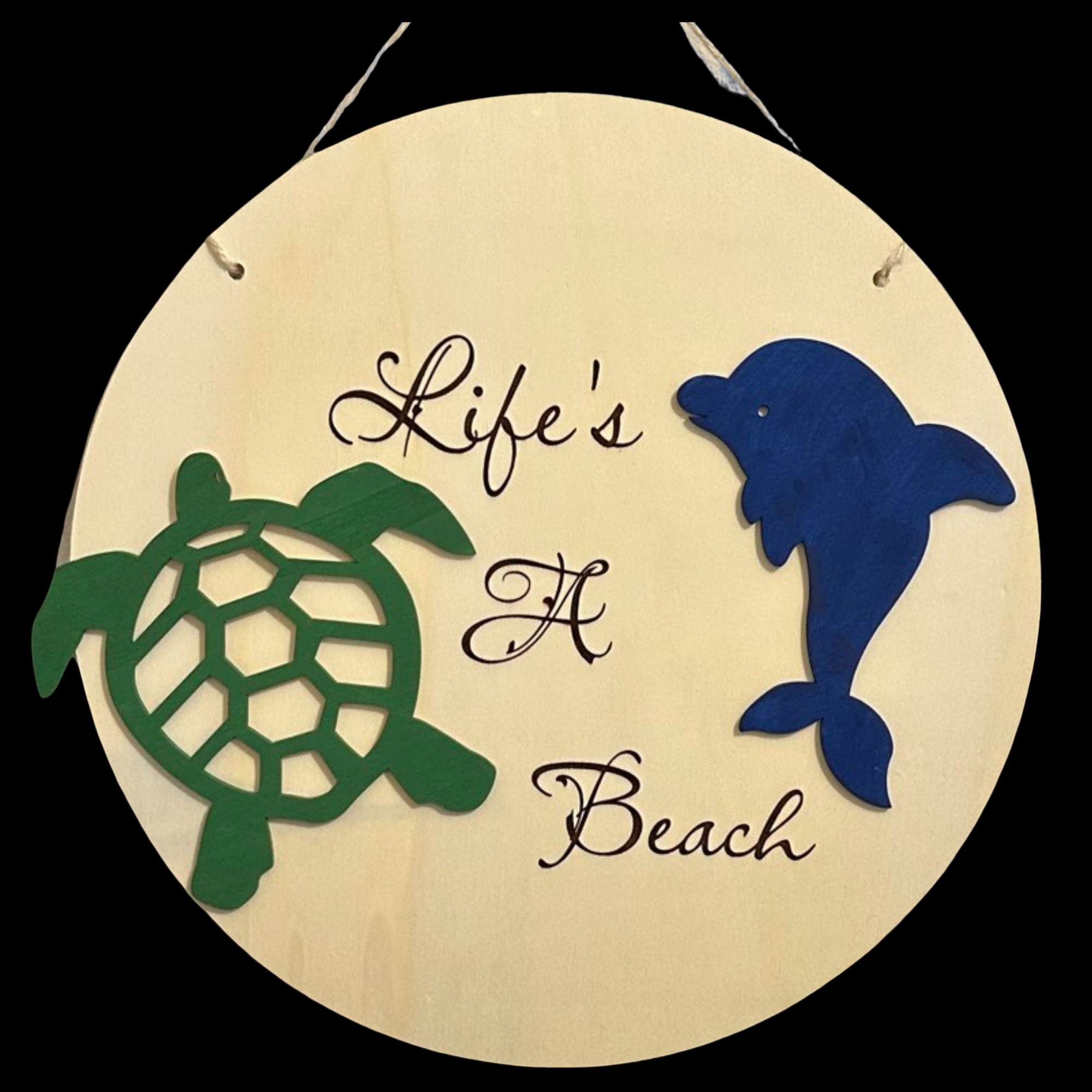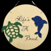 This is a handmade wood sign. It is laser engraved with the saying, “Life’s A Beach”. It also has a painted wood green turtle and blue dolphin that are glued on it. The front is sealed with clear coat as well. It has two holes for hanging with a twine hook. It is approx. 12×12 inches in size.