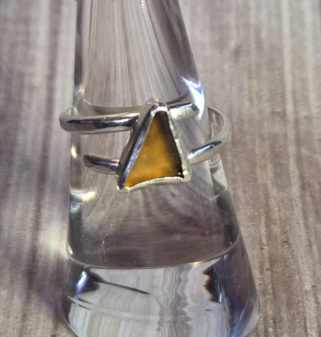 This ring displays a perfectly sea tumbled piece of light brown seaglass. Slight hammered texture to band.