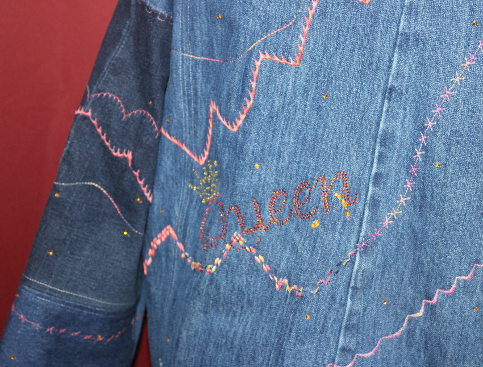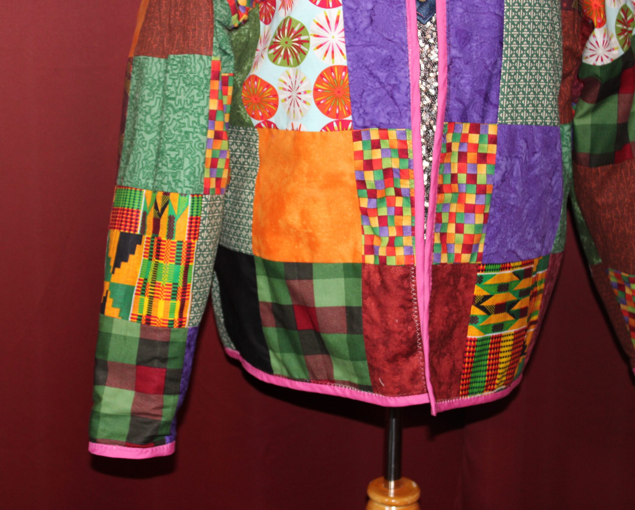 Upcycled Denim Jacket designed in a denim patchwork and embellished with pink decorative stitches, bling, embroidery patches, and pink binding. Pockets have been placed on each side of the front with bling trim. This jacket is fully lined with patchwork cotton prints, making the inside just as beautiful as the outside. Embroidery patches dedicated to the queen who wears this jacket have been added. This jacket is one of a kind and unique. Women’s Size XL. Handwash