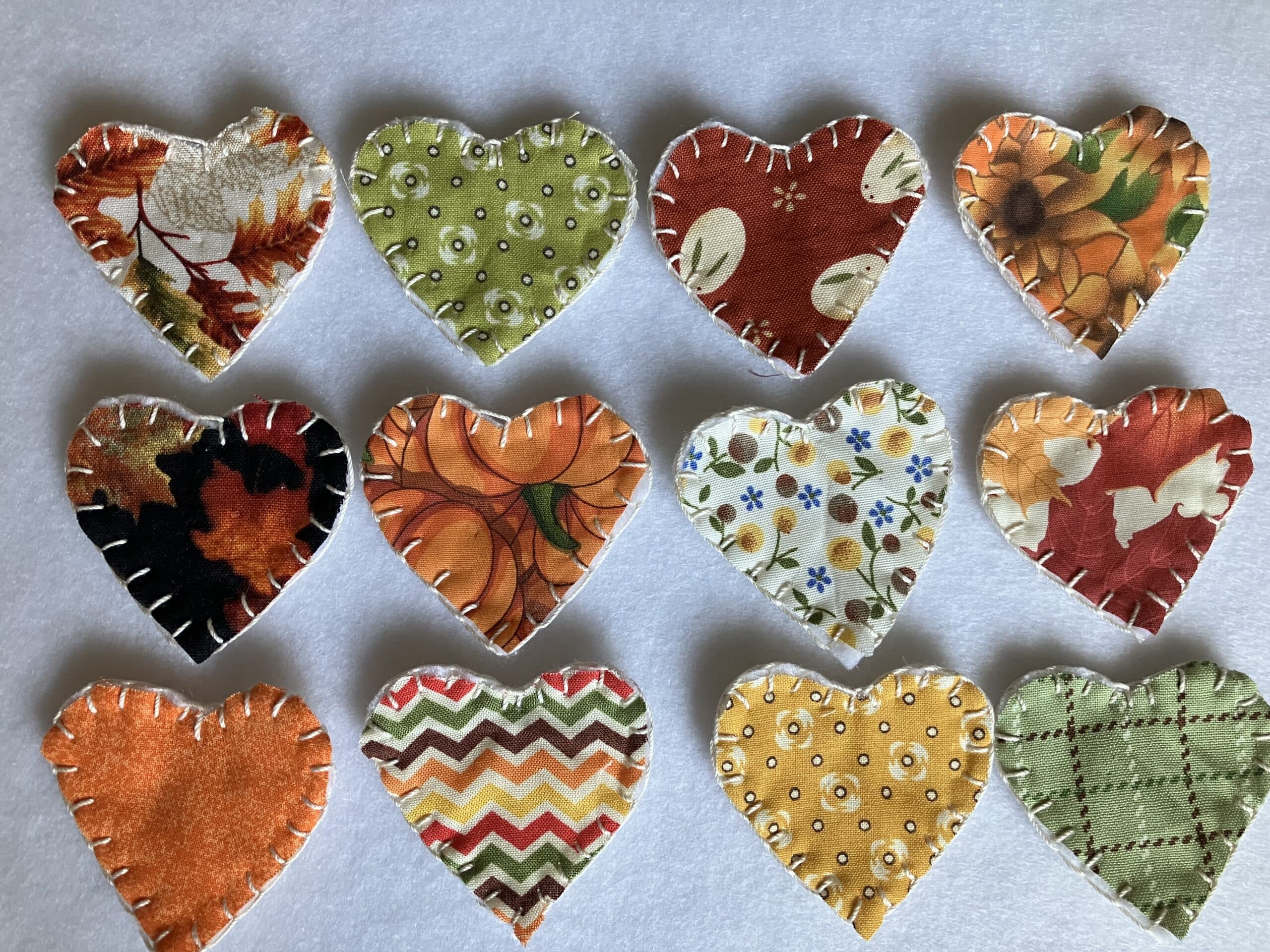 Fabric heart and flower have a quilt padding and unbleached cotton muslin back.