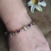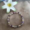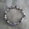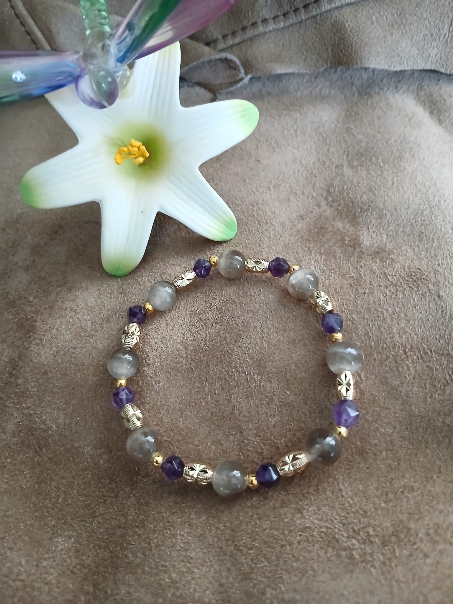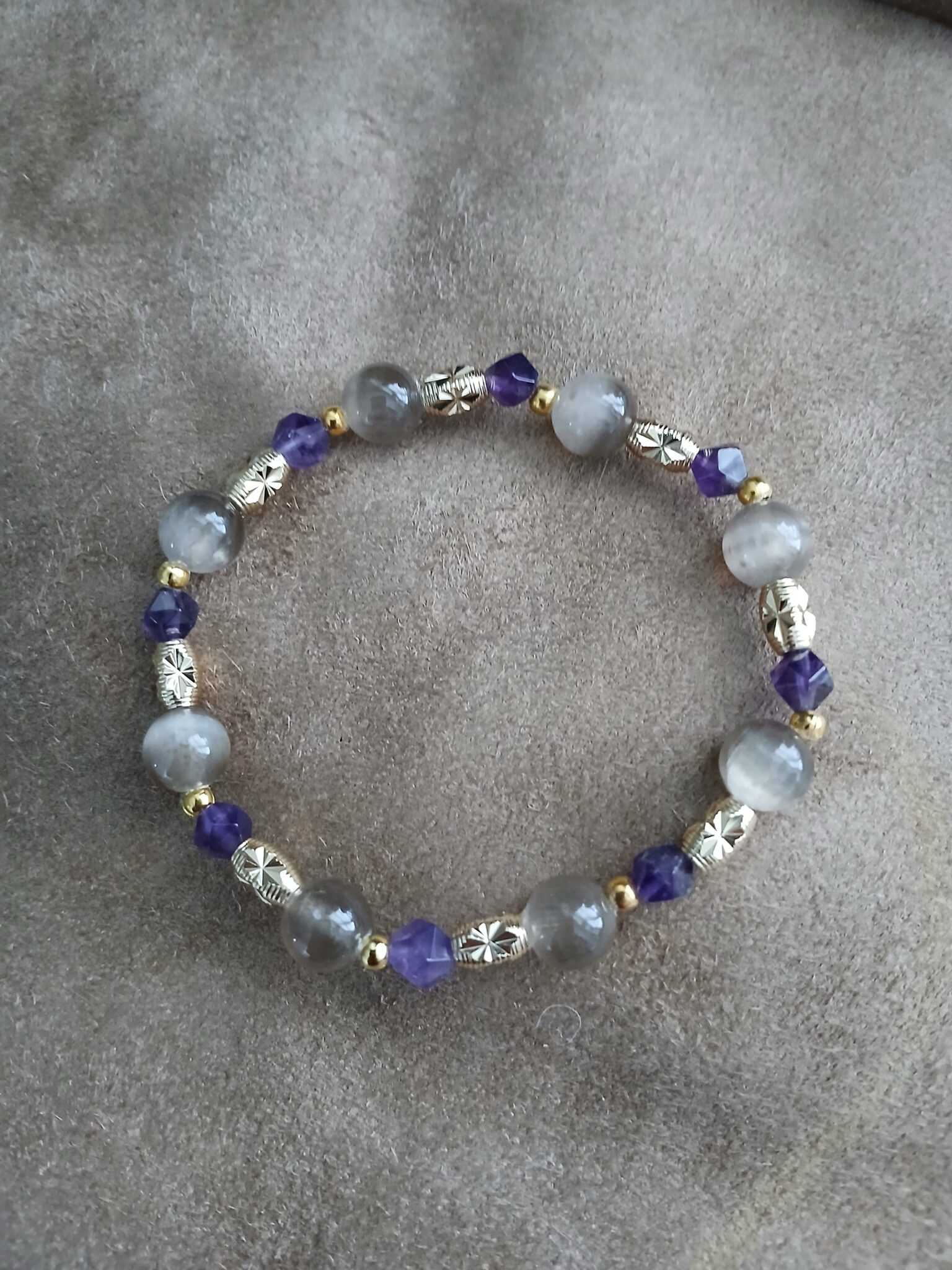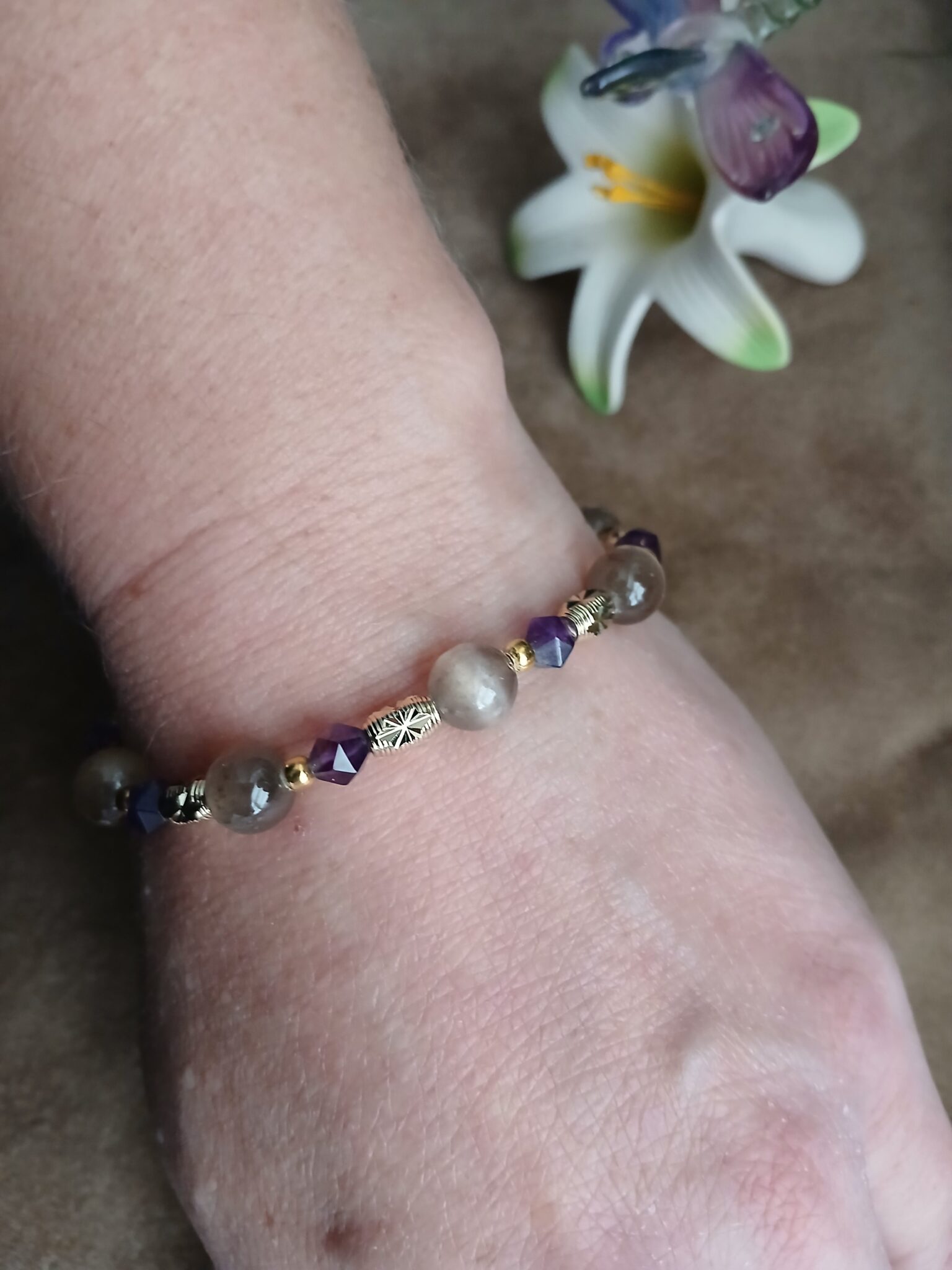 8mm Greige Selenite and 5mm star cut Amethyst with goldtone accents, 7 1/4″ (not sizable).