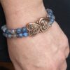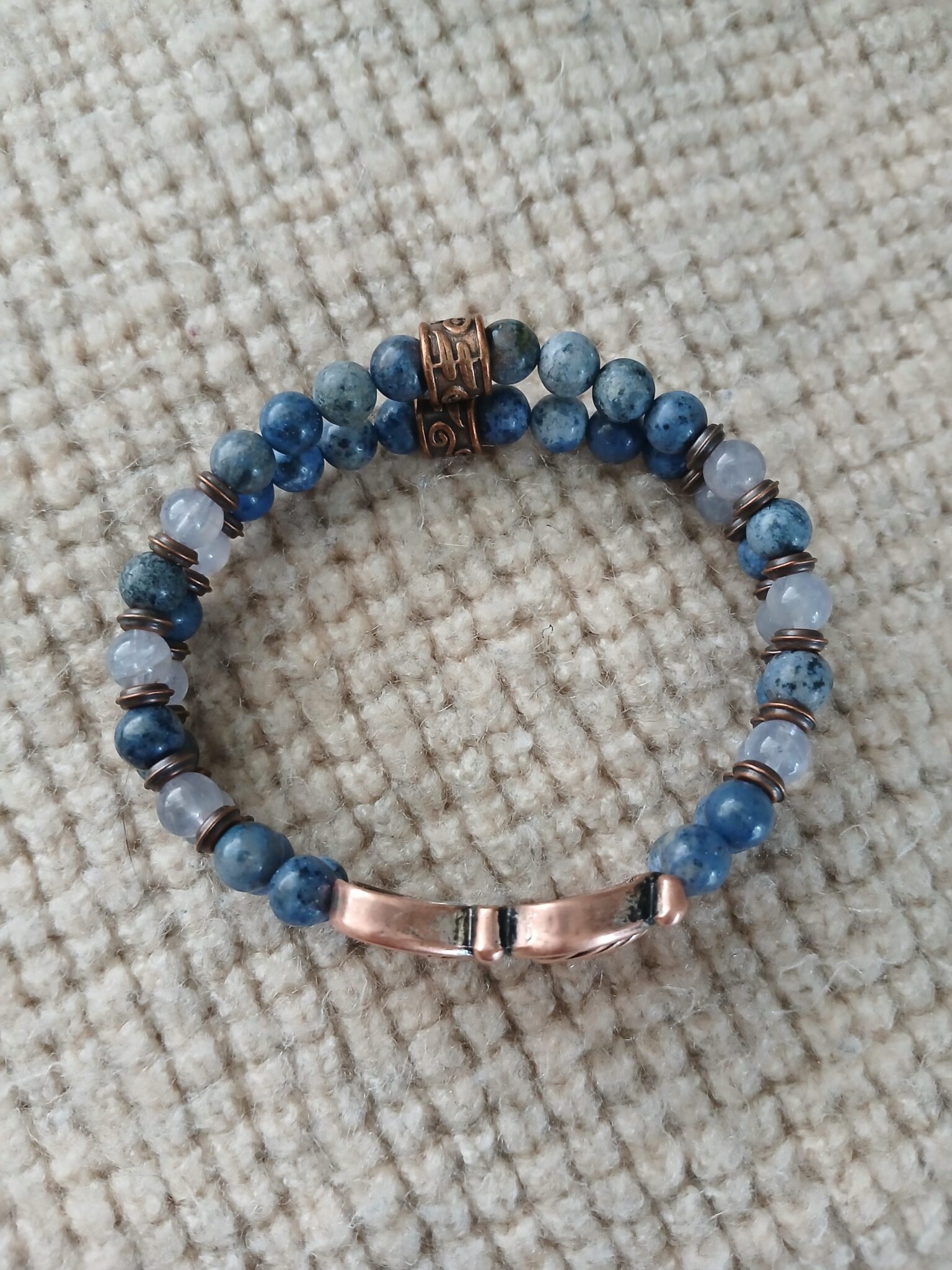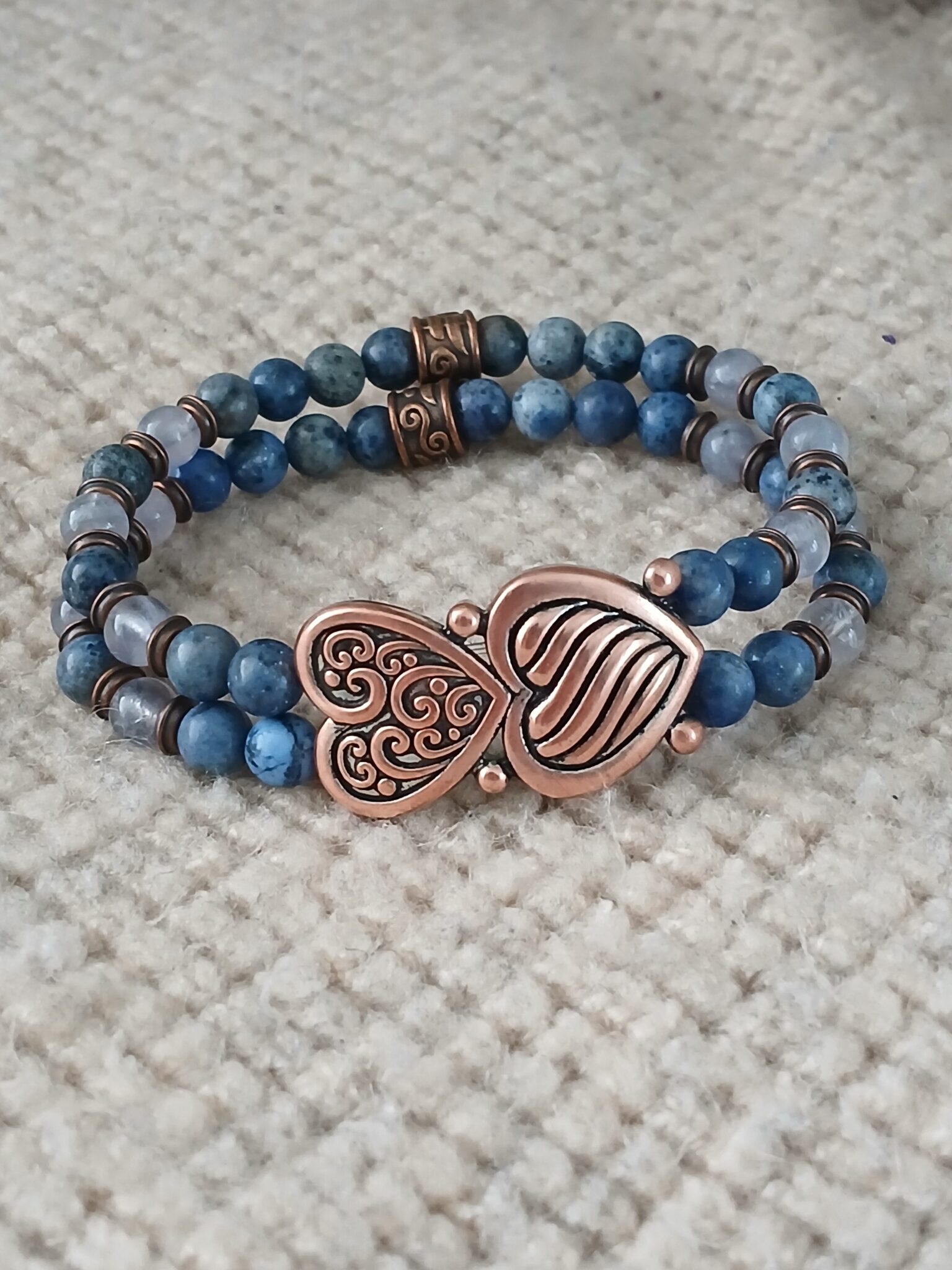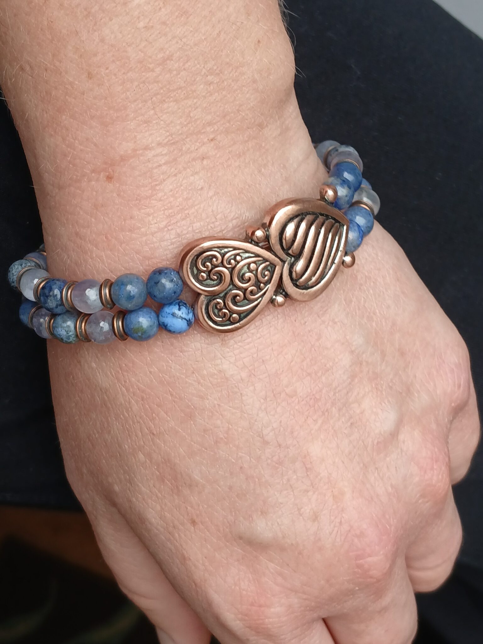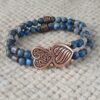Double-row 8mm Dumortierite and Iolite with antique copper accents. Specify desired size in order notes (if no size is specified, standard 7 1/2″ bracelet will be sent).
