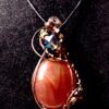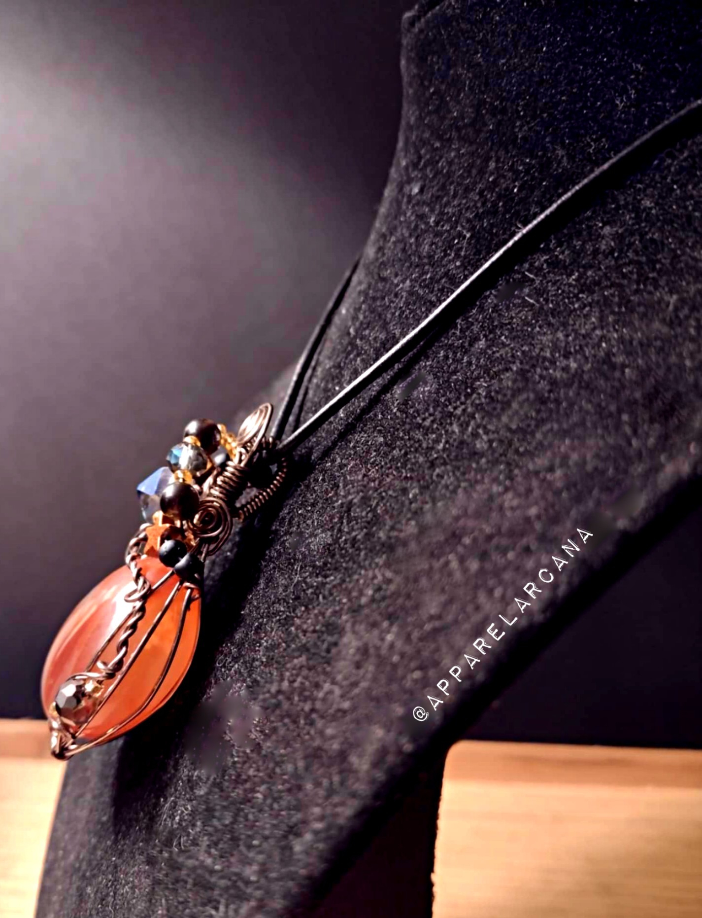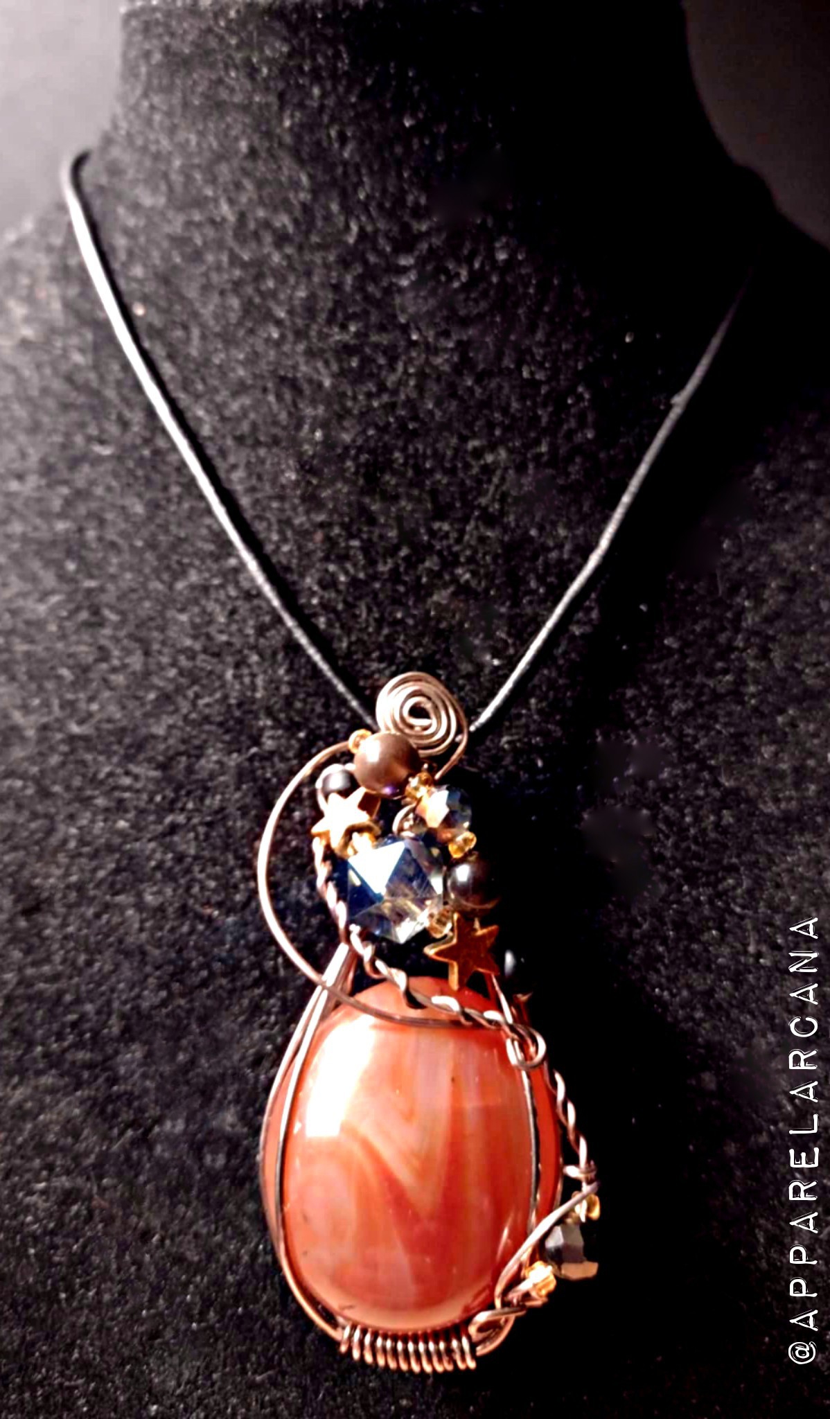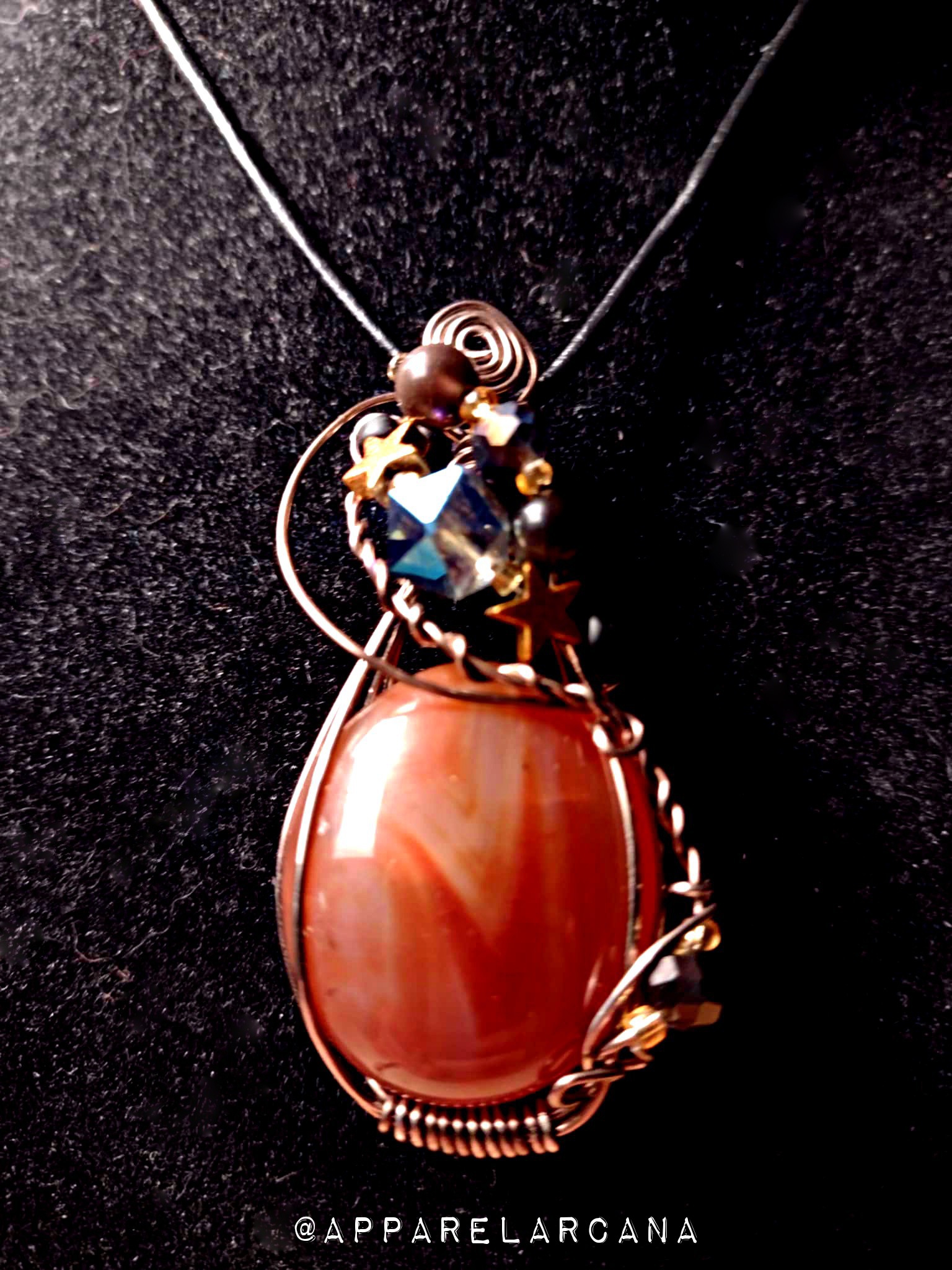 Spellbound features an orange/red dyed banded agate focal, wrapped in a four wire frame of 20g antique finish copper wire. Silver Obsidian, Orange hematite stars, gold glass seeds, Blue Star cut and ab gray electroplated glass rondelles make up the accent design. This piece comes with a black leather cord, with a 3″ chain extension. The pendant portion measures approximately 3″ tall, with a cord drop length of 10″. This is a one of a kind piece.