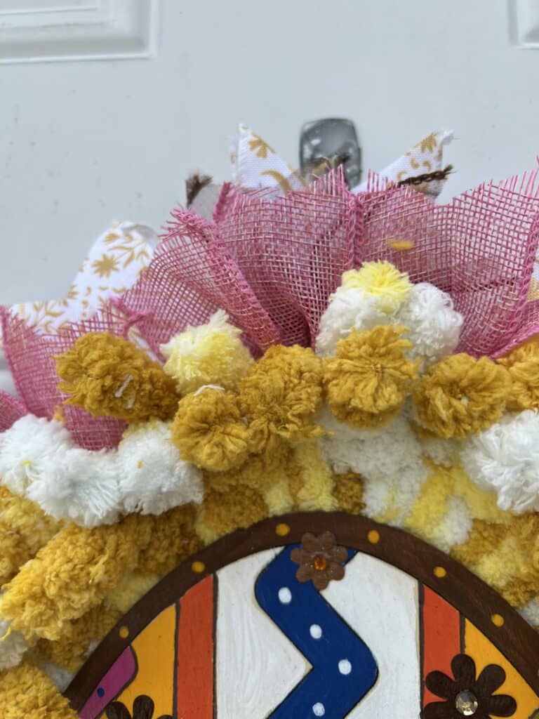 This one-of-a-kind wreath features a wooden center in a bold and bright design showcasing a chocolate brown bunny outlined in soft, colorful yarn in a mesmerizing pattern. The juxtaposition of the smooth wood and the cozy yarn creates a tactile masterpiece that will instantly draw the eye and spark conversation.