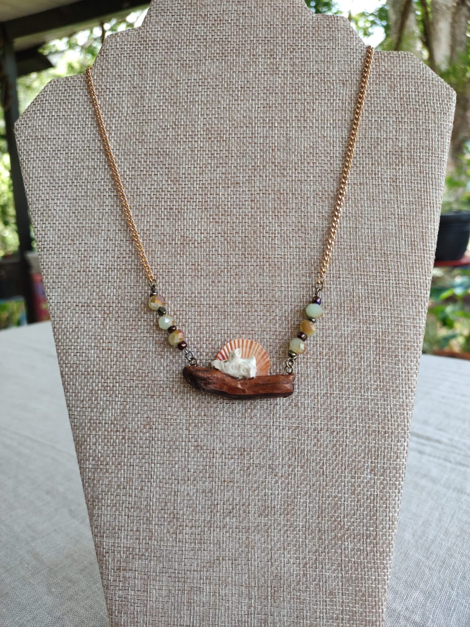 Gorgeous handcrafted statement necklace and earrings set embellished with driftwood, coral, beautiful seashells and stunning irredescent beading.