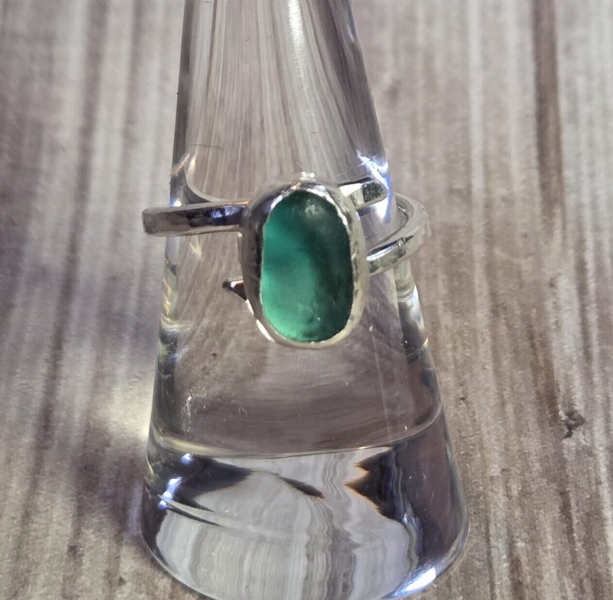 This ring displays a beautifully polished teal glass pebble. Hammered band.