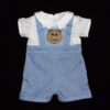 A shortall with an attached shirt. The overall part is made of blue and white gingham cotton fabric. Bib has an appliqued Teddy Bear face It is hand embroidered with black bead eyes. You can ask for black felt eyes with an embroidered white dot for accent. No extra charge. I used fleece for the face for a fuzzy texture. The shirt is white cotton and the bodice is fully lined. It snaps on the inner legs for diaper changing and zips in back. Teddy Bear shoes are not included. You can order them for an extra $15. The sizes you can order for the romper are infant -7lbs., 1-3 months, 6 months, 12 months, and 18 months. The size in stock is 6 months. Also if in stock, I will send in 2 days ar less. If not it is a 1-2 weeks.