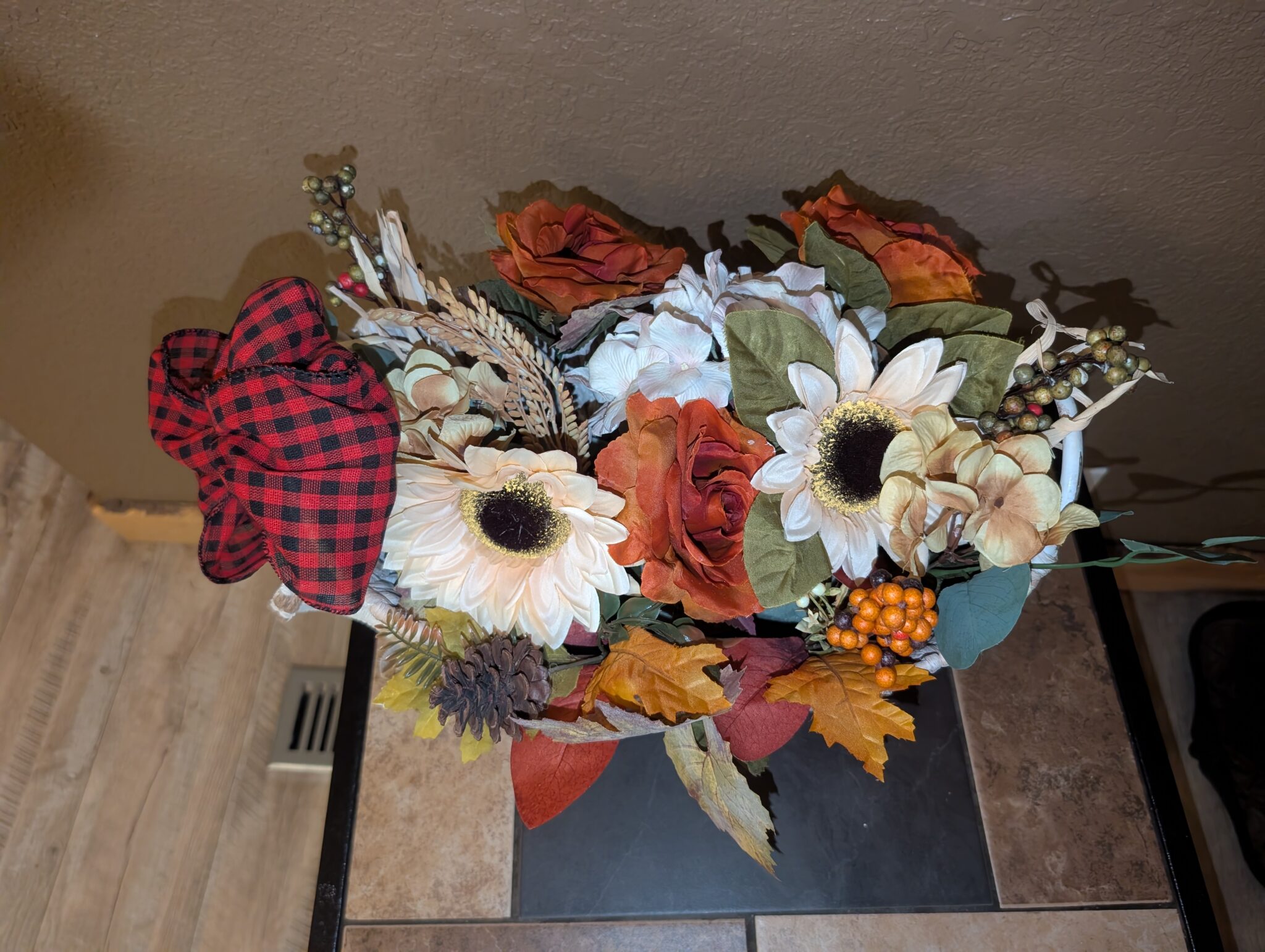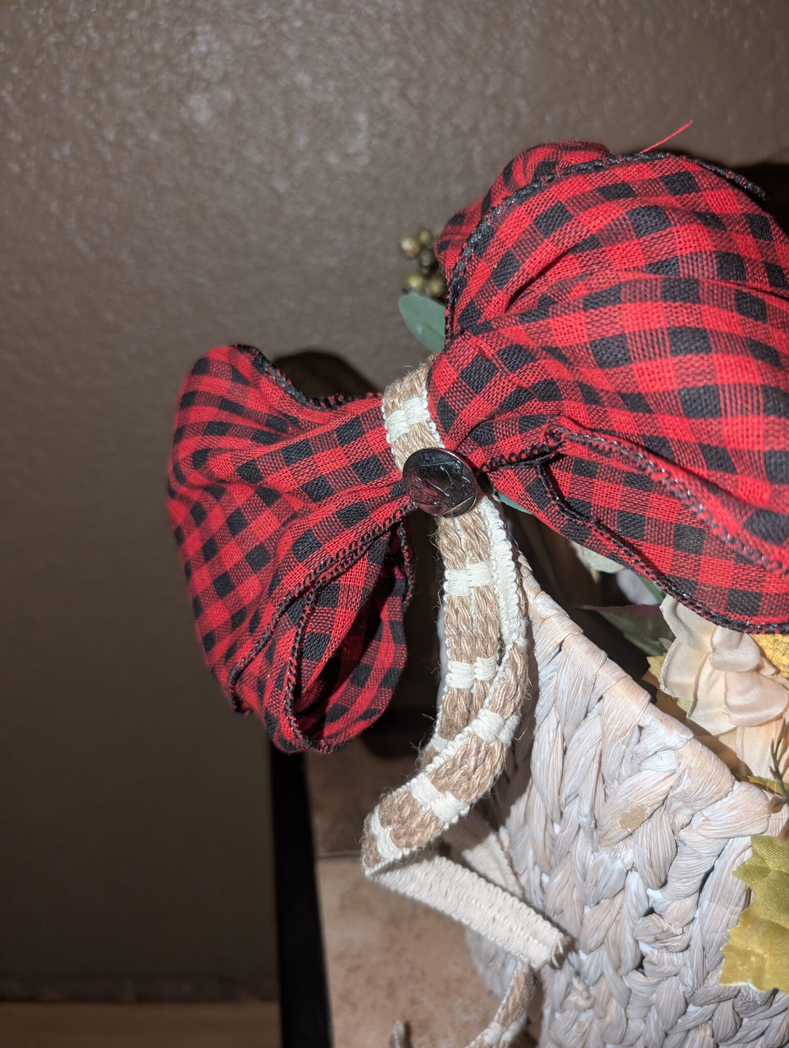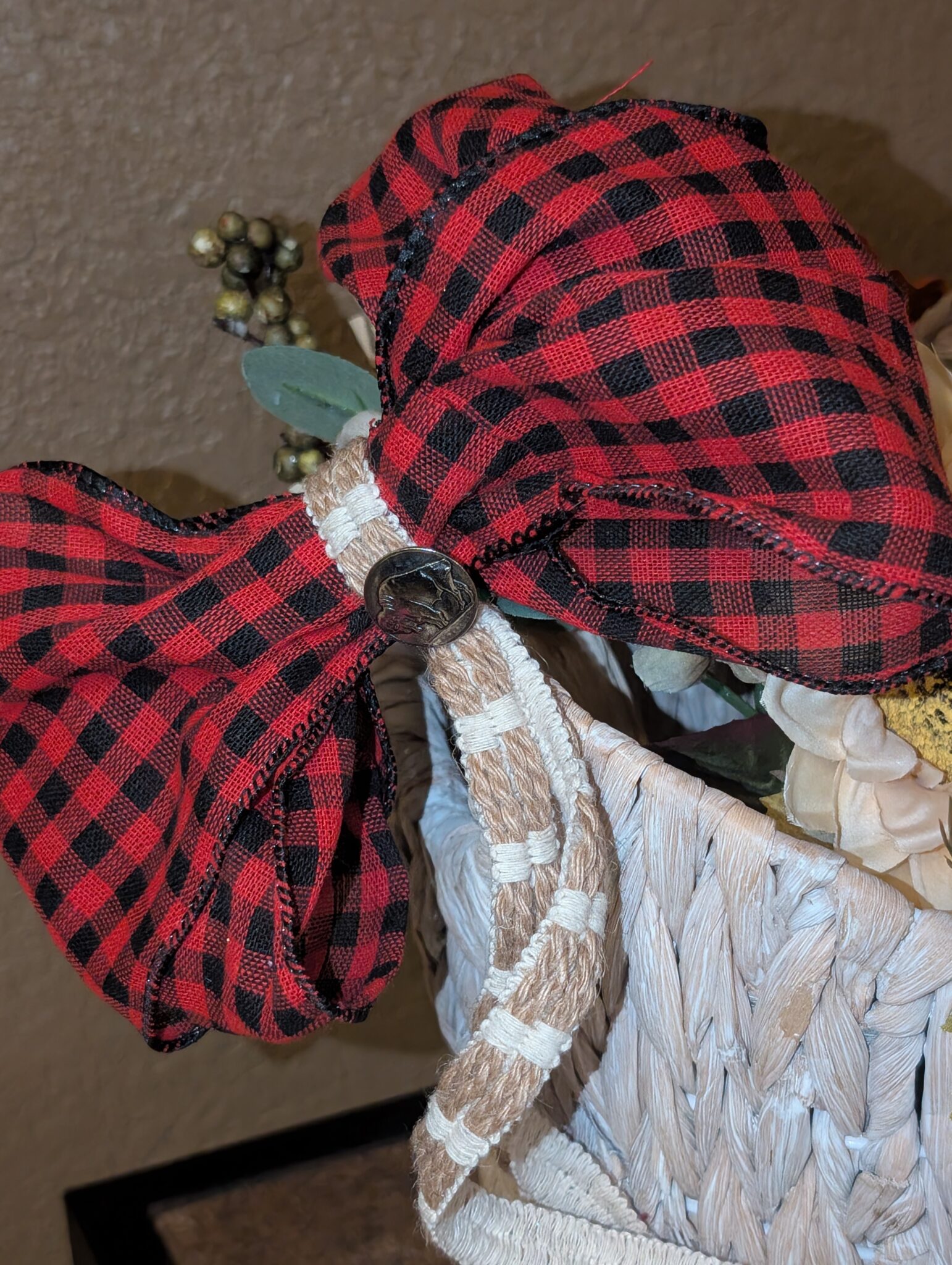 ​The finishing touch? A generous, rustic red buffalo check bow—because nothing says ‘cozy country’ like a little checkered charm!