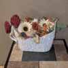​Hand-arranged by this mountain mom, this piece perfectly complements the rustic spirit of our Barbed Wire Wreaths. It features a whitewashed woven basket filled with a cheerful mix of high-quality faux florals, including vibrant sunflowers, classic red roses, pinecones, and bright orange berries.