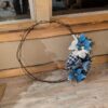 The foundation is our signature authentic barbed wire, hand-formed from our own ranch fencing, giving it that genuine, rugged mountain soul. Against this raw texture, we’ve arranged a breathtaking cluster of icy blue and crisp white poinsettias, frosted berries, and pine accents.