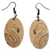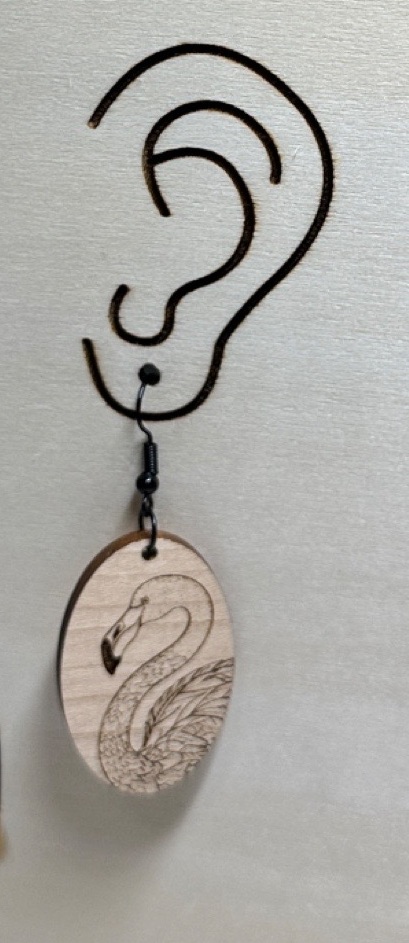 These are a pair of laser cut lightweight flamingo wood dangle earrings. There is no design on the back. They are made from 1/8 in thick medium maple hardwood. They are on ear wires. All metal components are silver, gold, or brass plated, or black alloy, nickel & lead free, and hypoallergenic. They are approx. 1.5″ in long. Backs not included but available upon request.