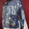 Upcycled Denim Patchwork Jacket, bleached and splatter paint details. The unique hand-painted jacket is extra unique. Bling crown appliques make the queen who wears this jacket feel extra special. Fully lined with patchwork cotton fabric makes the inside just as beautiful as the outside. Blue binding adds finishing touches. Women’s size XL, Handwash