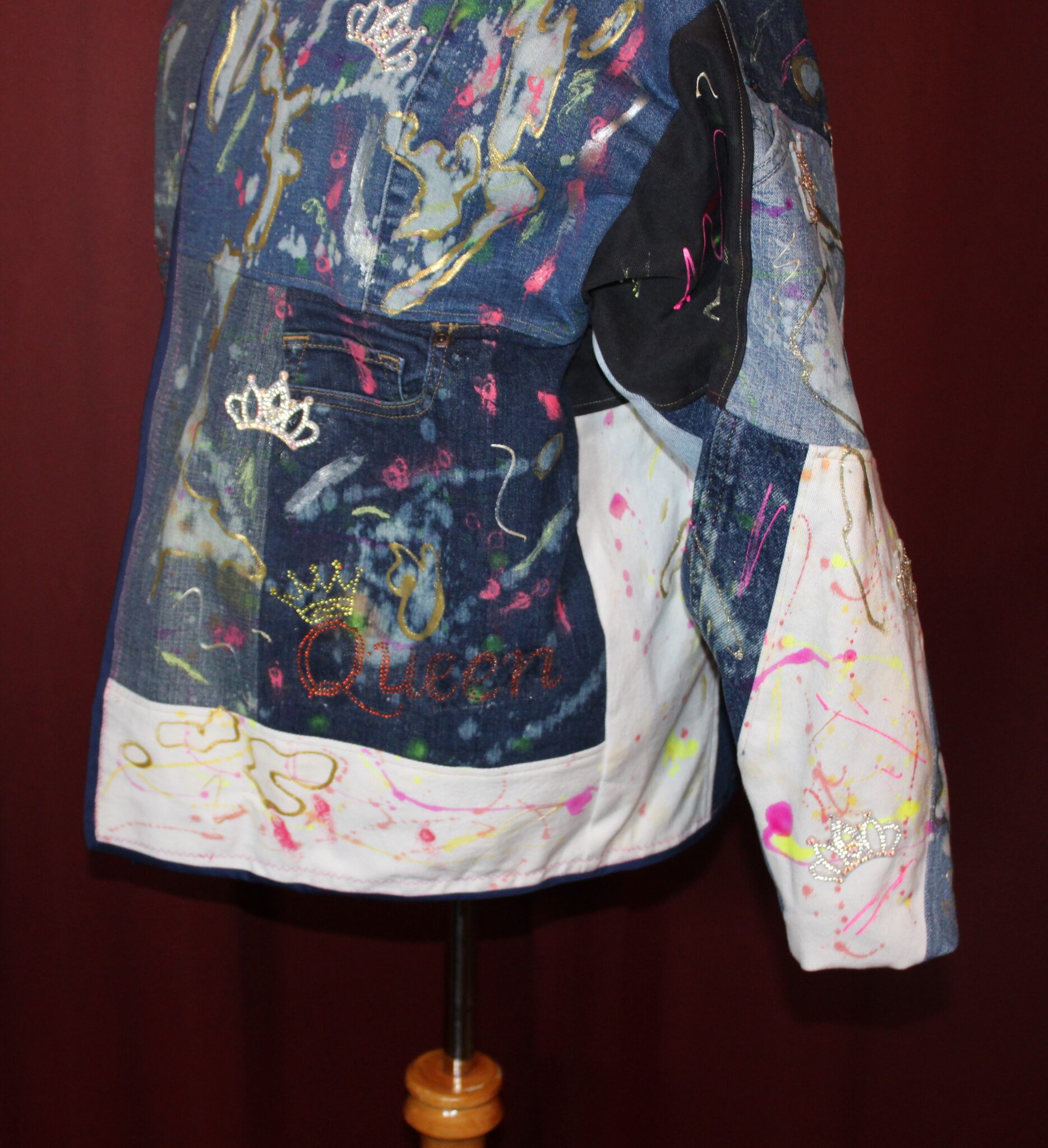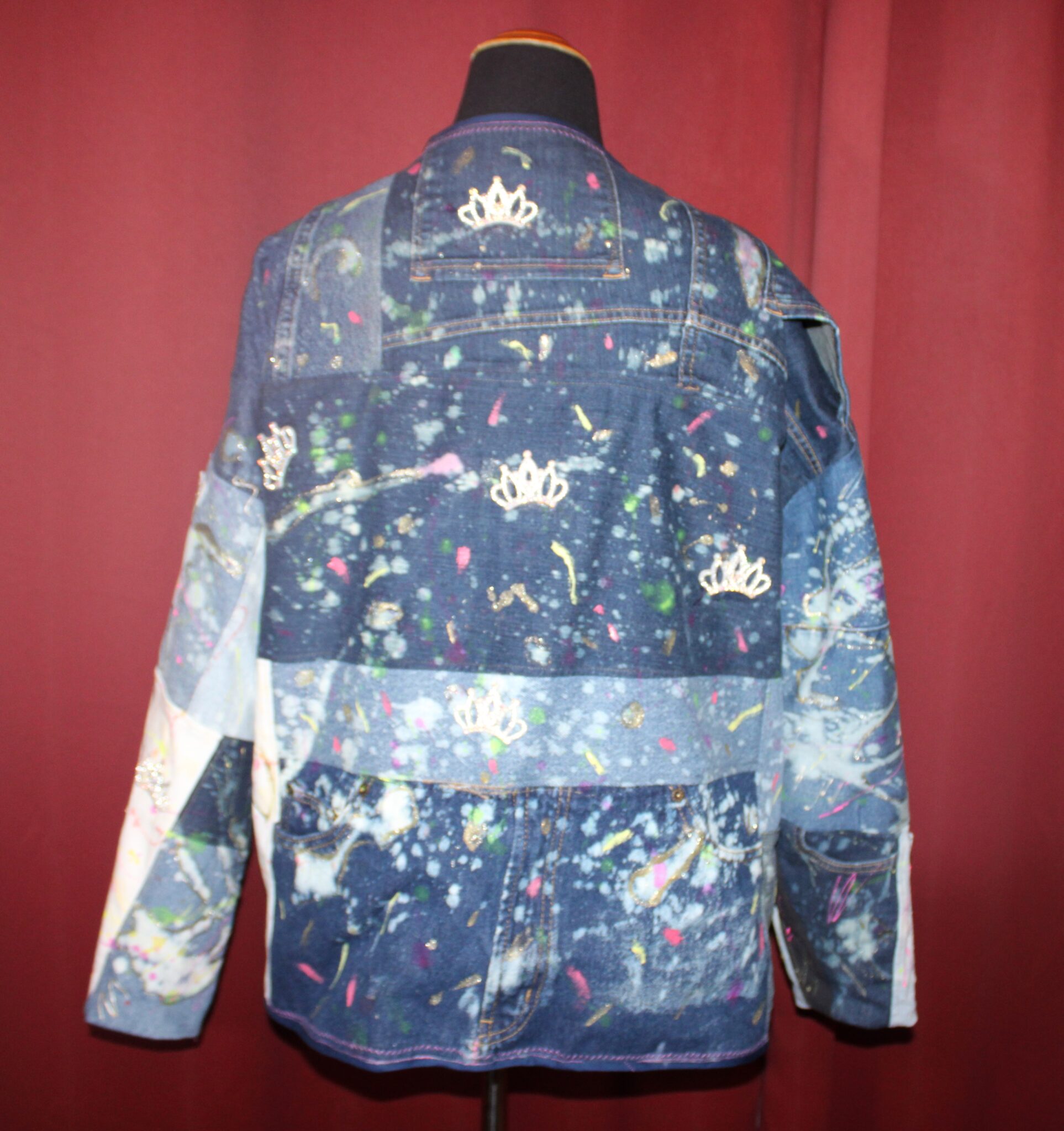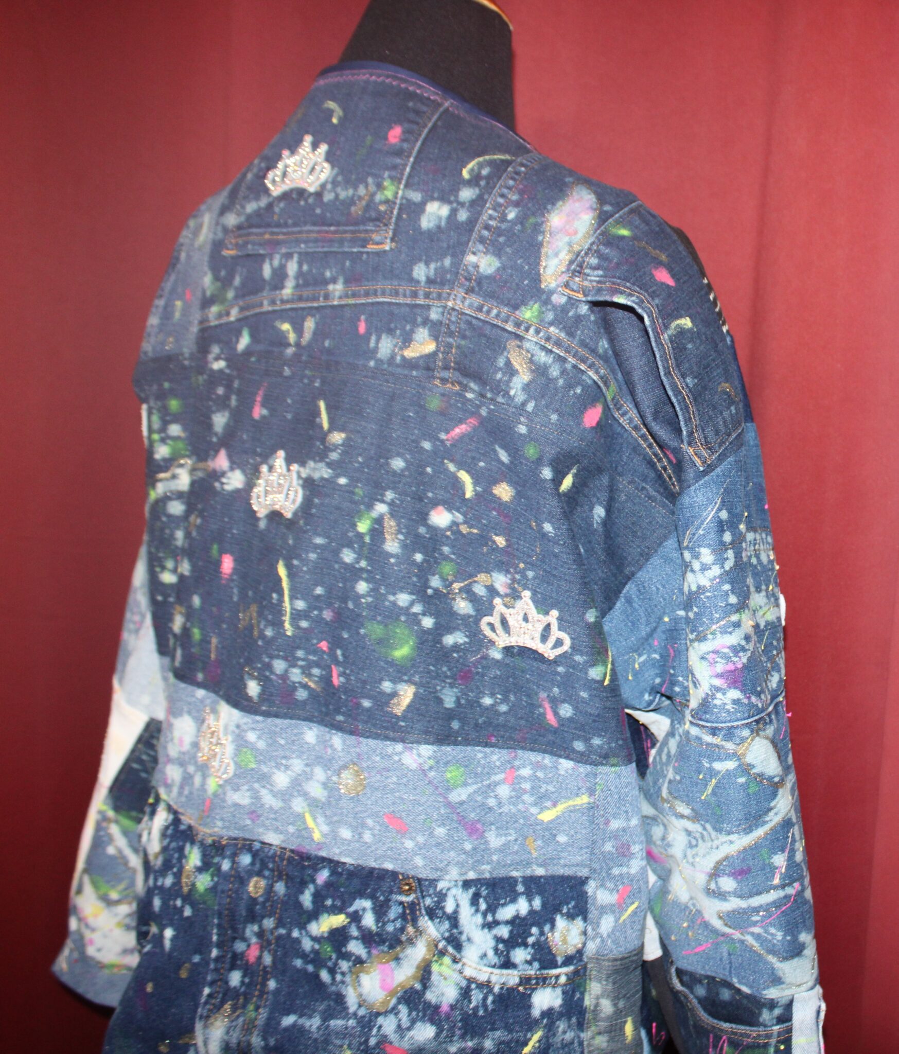 Upcycled Denim Patchwork Jacket, bleached and splatter paint details. The unique hand-painted jacket is extra unique. Bling crown appliques make the queen who wears this jacket feel extra special. Fully lined with patchwork cotton fabric makes the inside just as beautiful as the outside. Blue binding adds finishing touches. Women’s size XL, Handwash