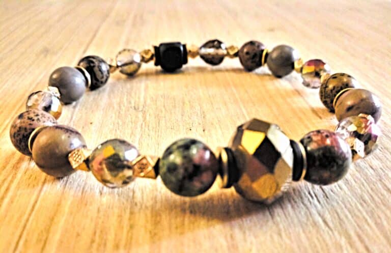 The Ursa Major bracelet (Constellation Collection),features (8) 8mm picture jasper beads, (2) 8mm unakite beads, (8) gold tone plated hematite disc spacers, (4) black plated hematite disc spacers, (6) faceted iridescent pear glass beads, (12) 4mm rose toned stamped metal beads, (1) 10mm faceted gold tone glass accent bead and (1) wooden block logo bead. Double strand nylon stretch cord.