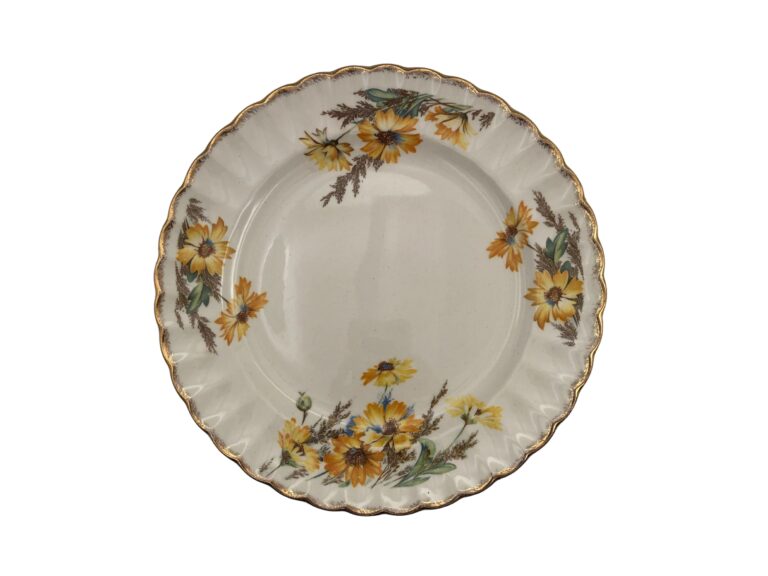 Captivating, elegant fine china Dinner Plate beautifully features darling yellow daisy, distinctive fluted border, 22k gold trims in classic timeless design.