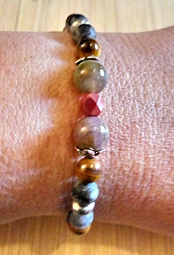The Vulpecula bracelet (Constellation Collection) features (10) 6mm matte labradorite beads, (10) 6mm brown tigers eye beads, (2) 8mm green jasper beads, (5) brick red faceted barrel glass beads, (6) silver glass spacer beads, (2) silver tone jackets, and 1 wooden block logo bead. Double strand nylon stretch cord.